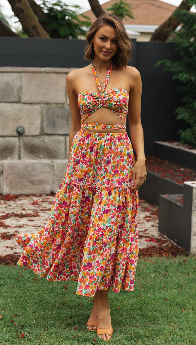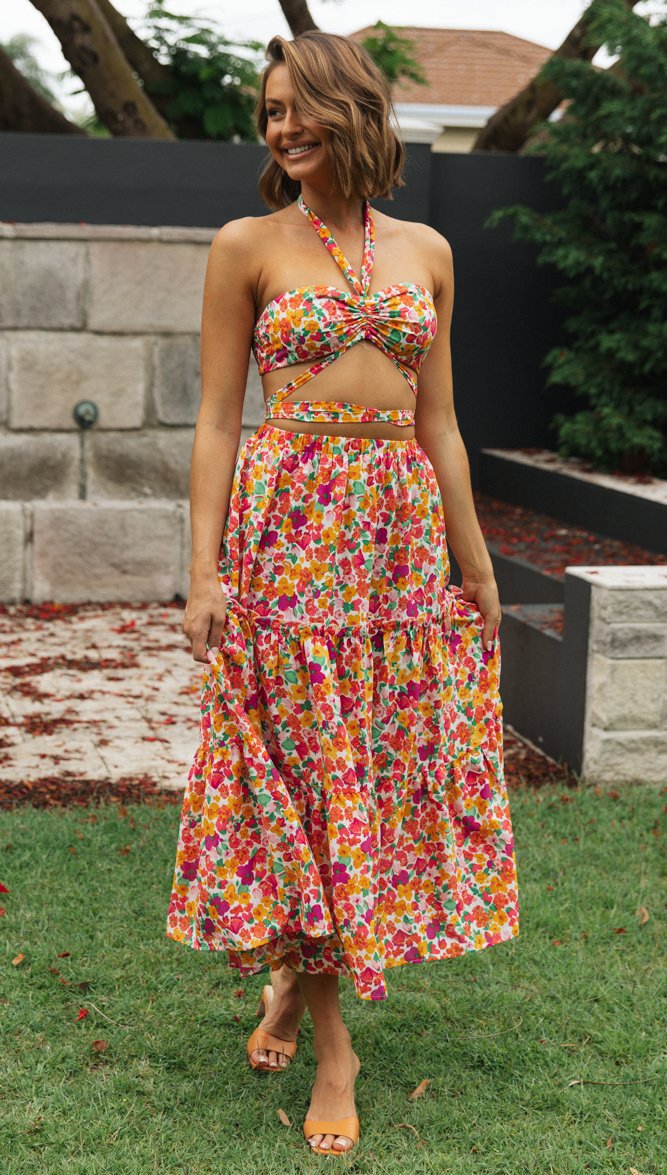 Spring Summer Sexy Halterneck Printed Tied Top Large Swing Dress for Women Floral Burst