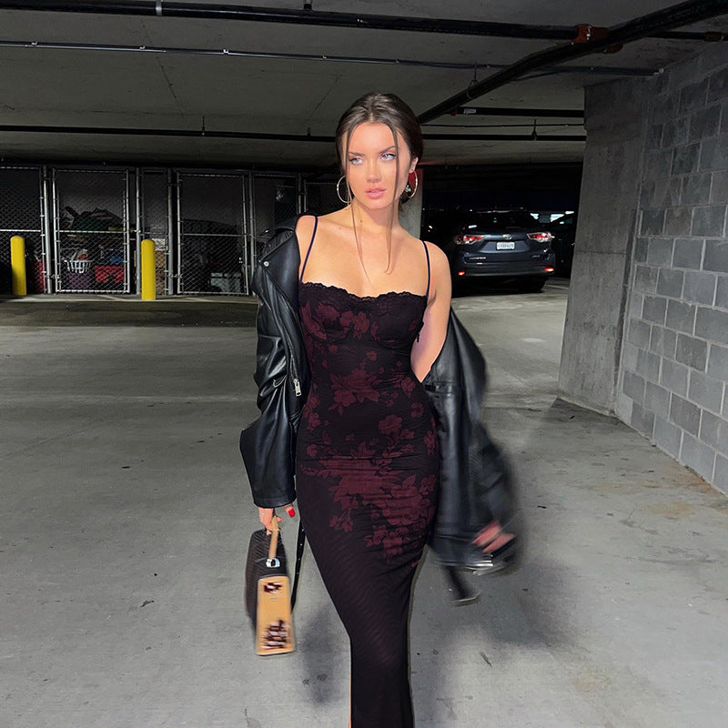 Spring Summer Women Sexy Strap Lace Slim Sheath Print Retro Dress