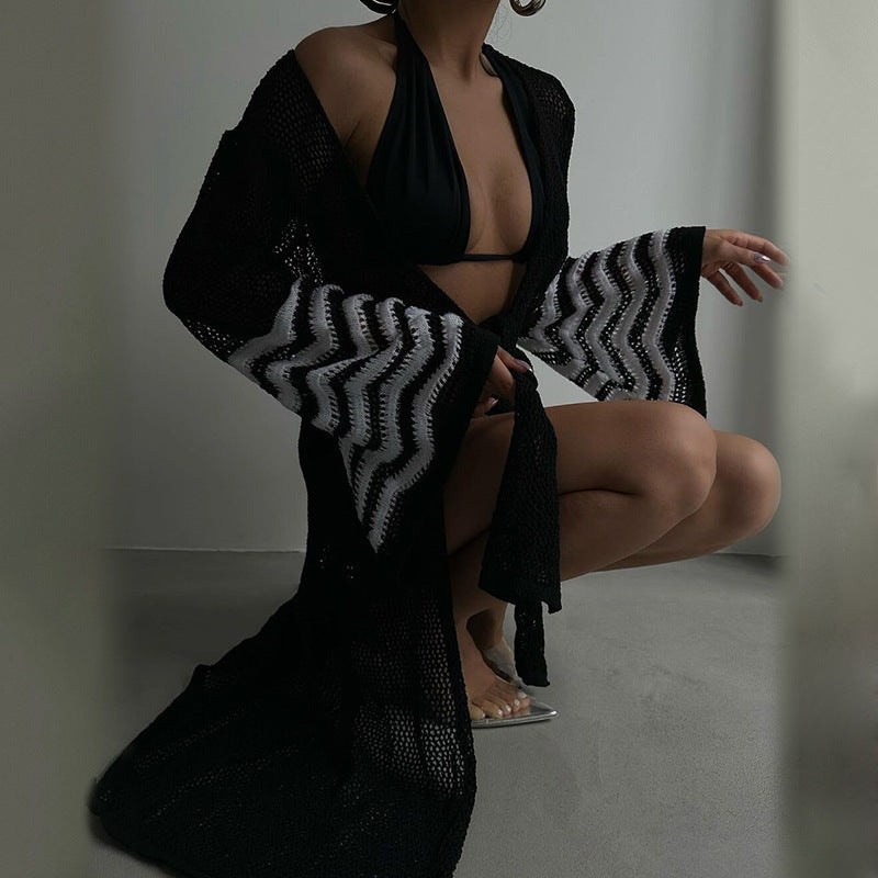 Summer Vacation Beach Dress Sexy Knitting Bikini Smock Dress Lace Up Bell Sleeve Dress Women