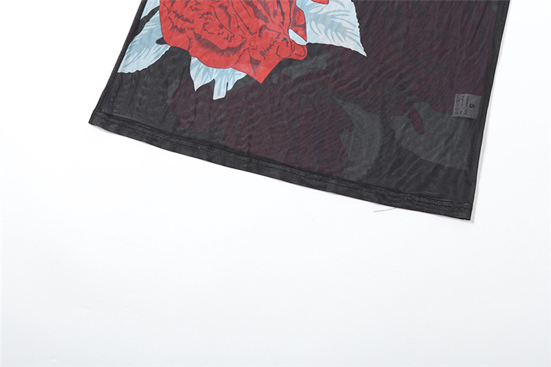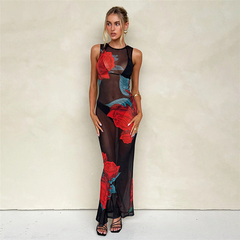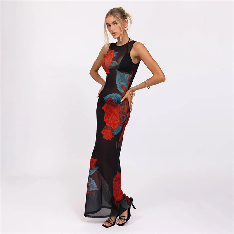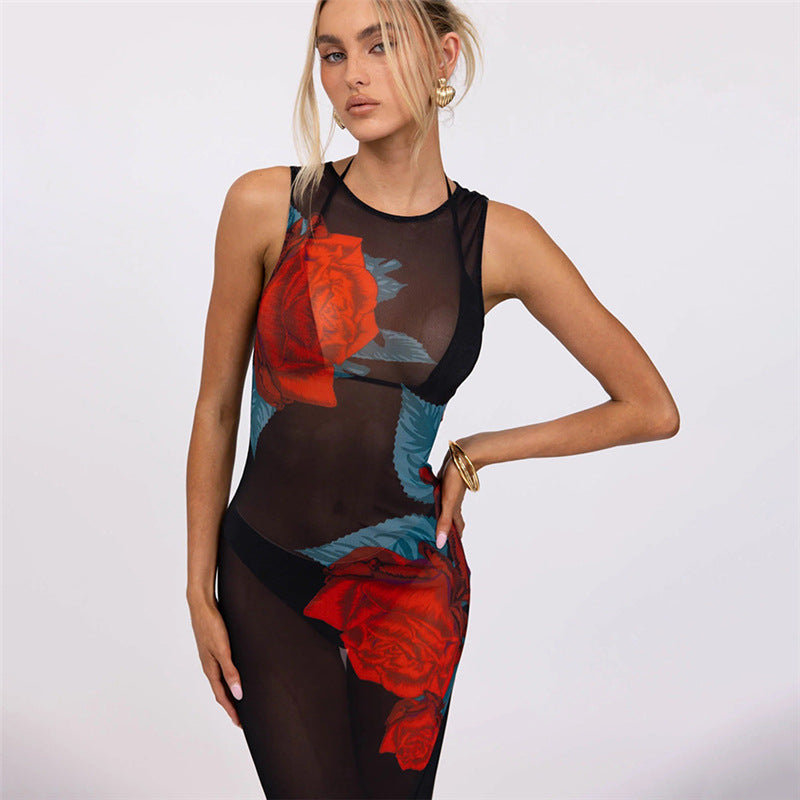 Summer Women Clothing Personalized Stylish Print Round Neck Slim Mesh Sexy Sheath Dress