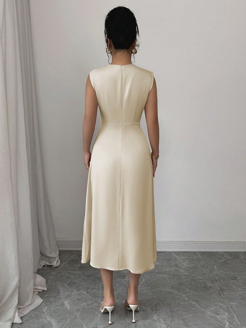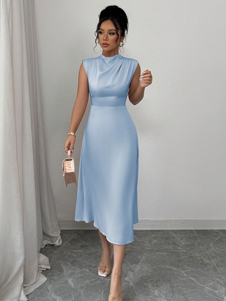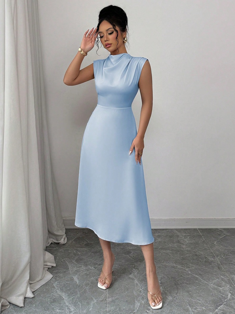 Women Clothing Summer Satin Women Pleated Satin Mid Length A line Dress