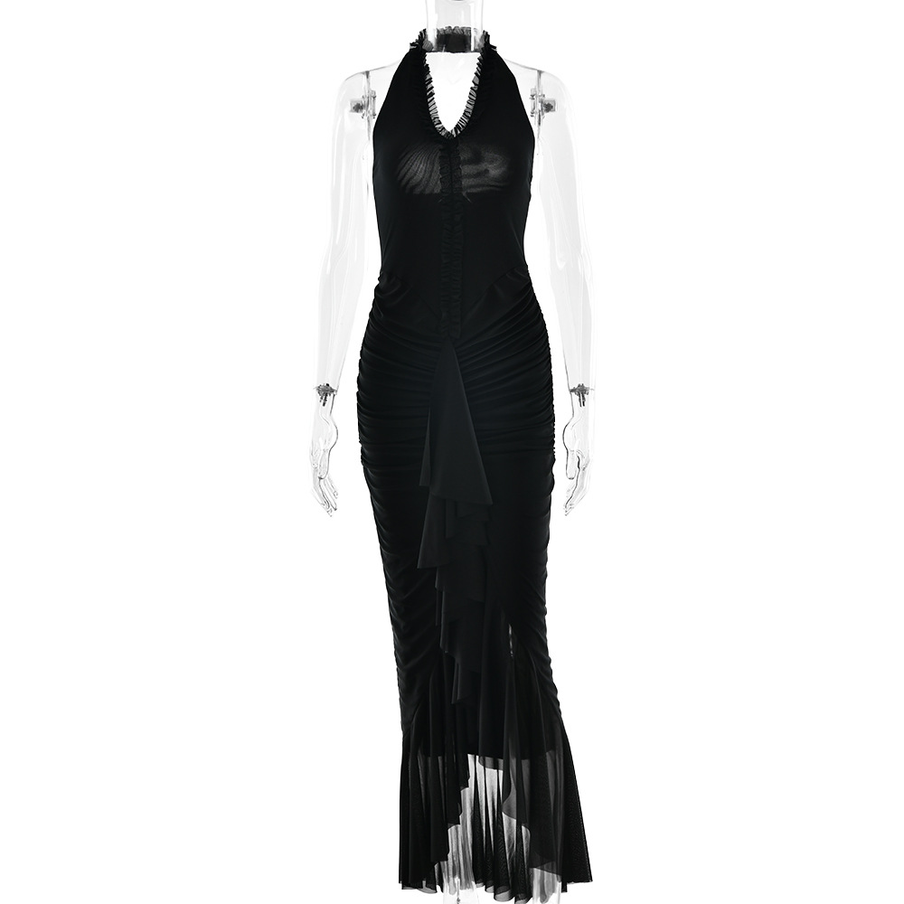 Arrival Sexy Halter Dress Summer Deep V Plunge Ruffled Slit Pleated Dress