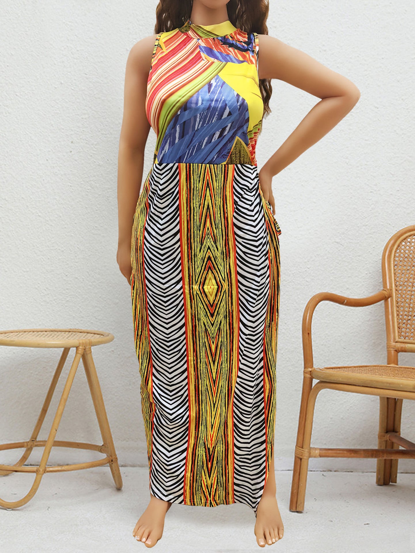 plus Size Women Women Clothing Summer Retro Mixed Color Printing Random Non Positioning Split Tied Dress