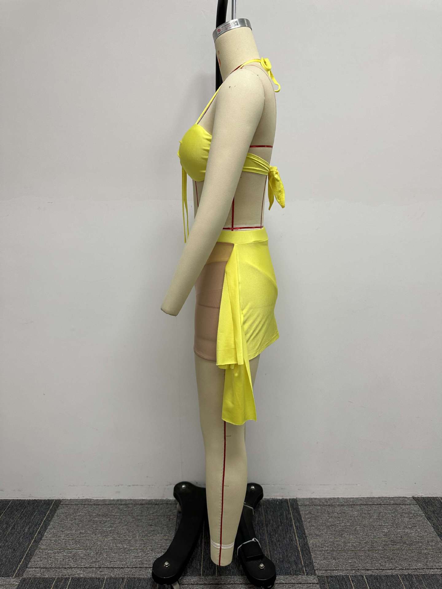 Sexy Solid Color Mesh Stitching See through Halter Strap Lace Swimsuit Three Piece Set