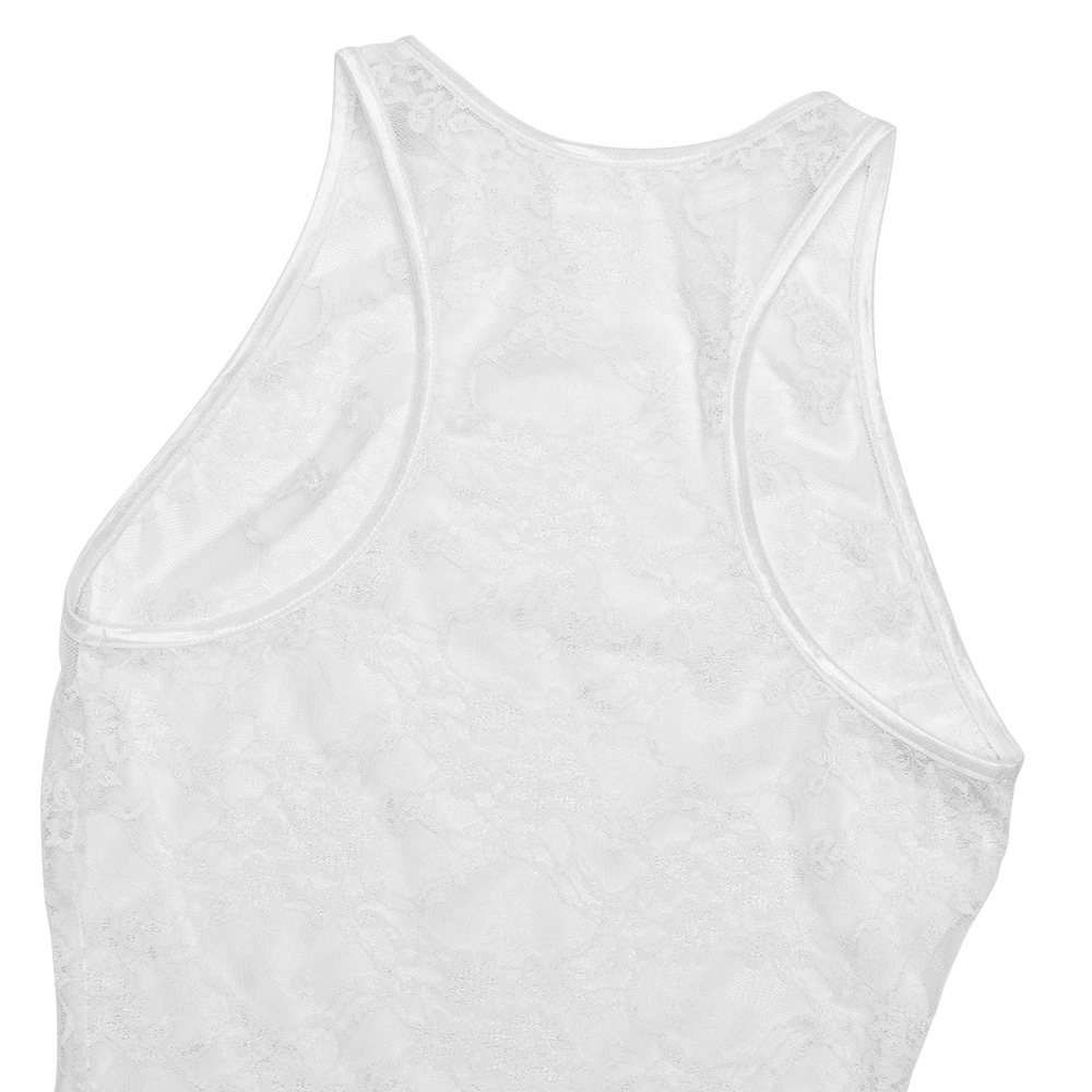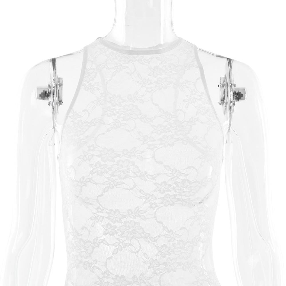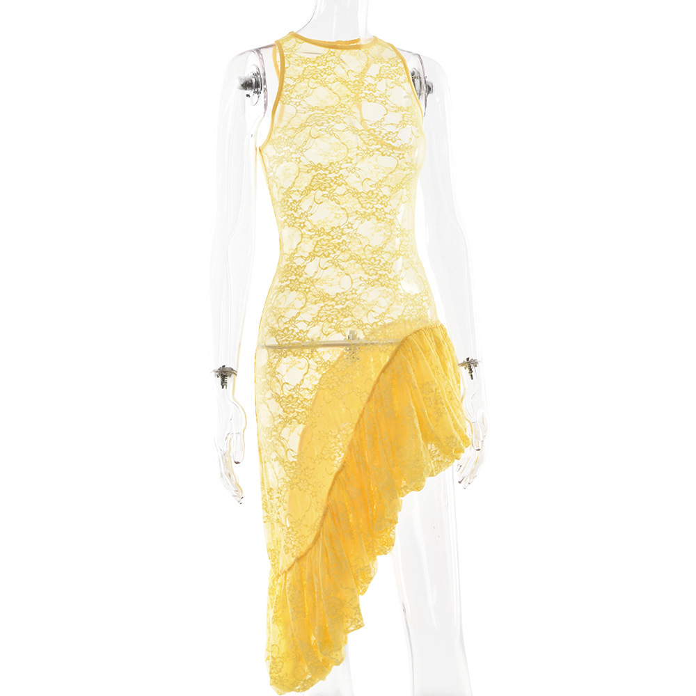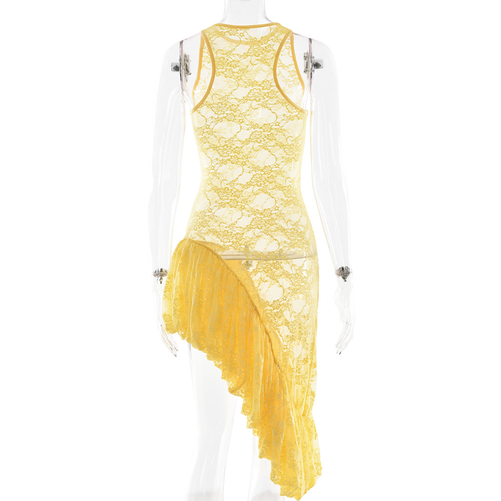 Sleeveless round Neck Dress Summer Sexy Lace See through Irregular Asymmetric Maxi Dress Women