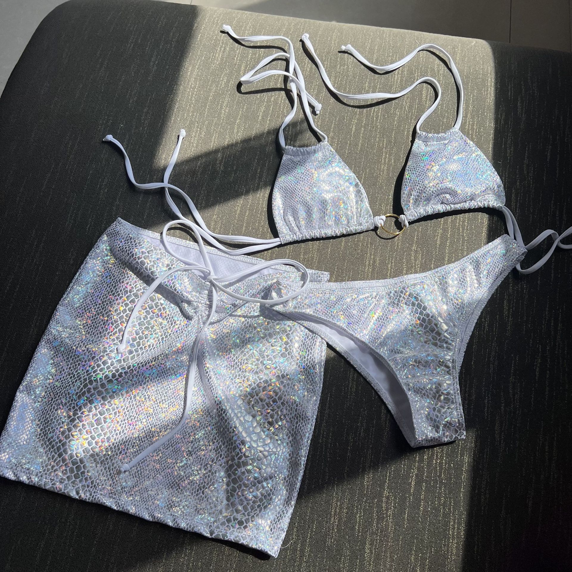 Snakeskin Pattern Drawstring Three Piece Short Skirt Bikini Swimsuit