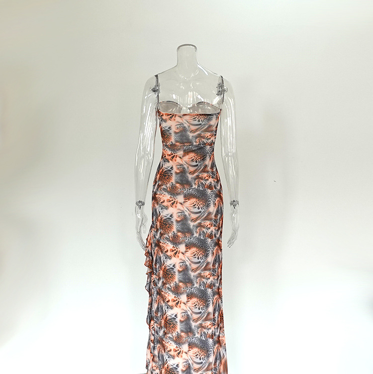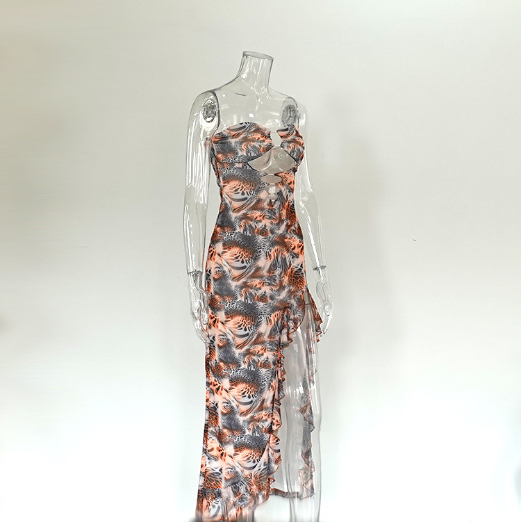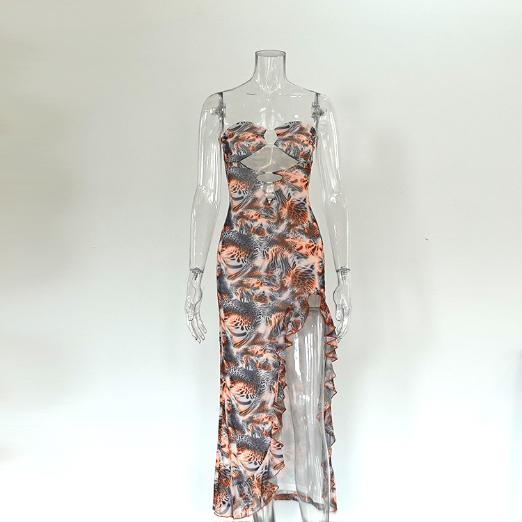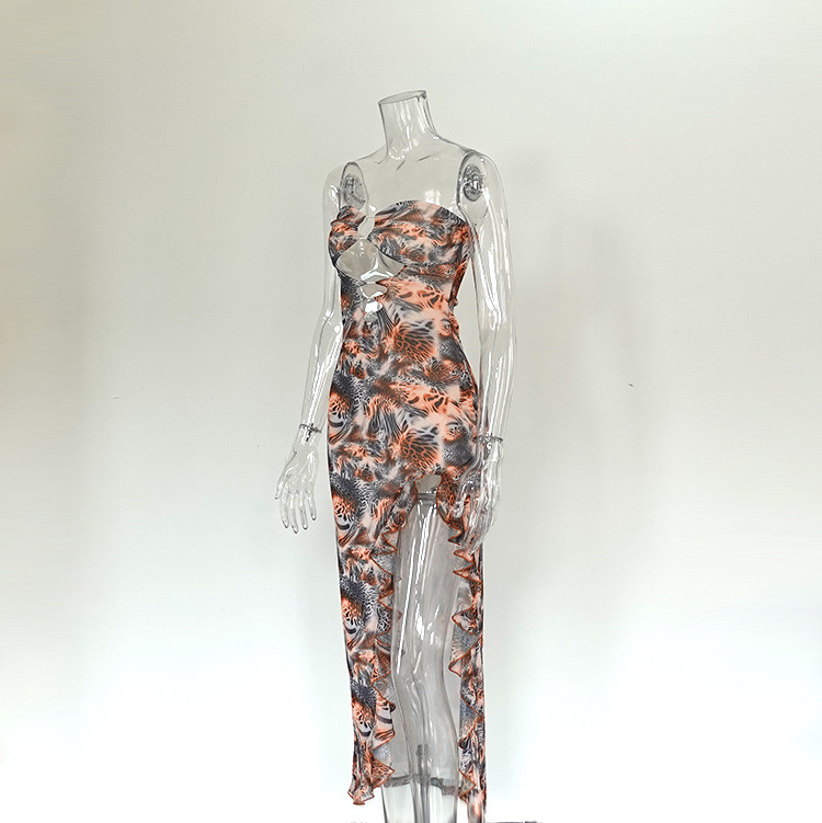 Summer Autumn Leopard Print High Waist Slit Sheath Dress Waist Tube Top Dress Women Clothing