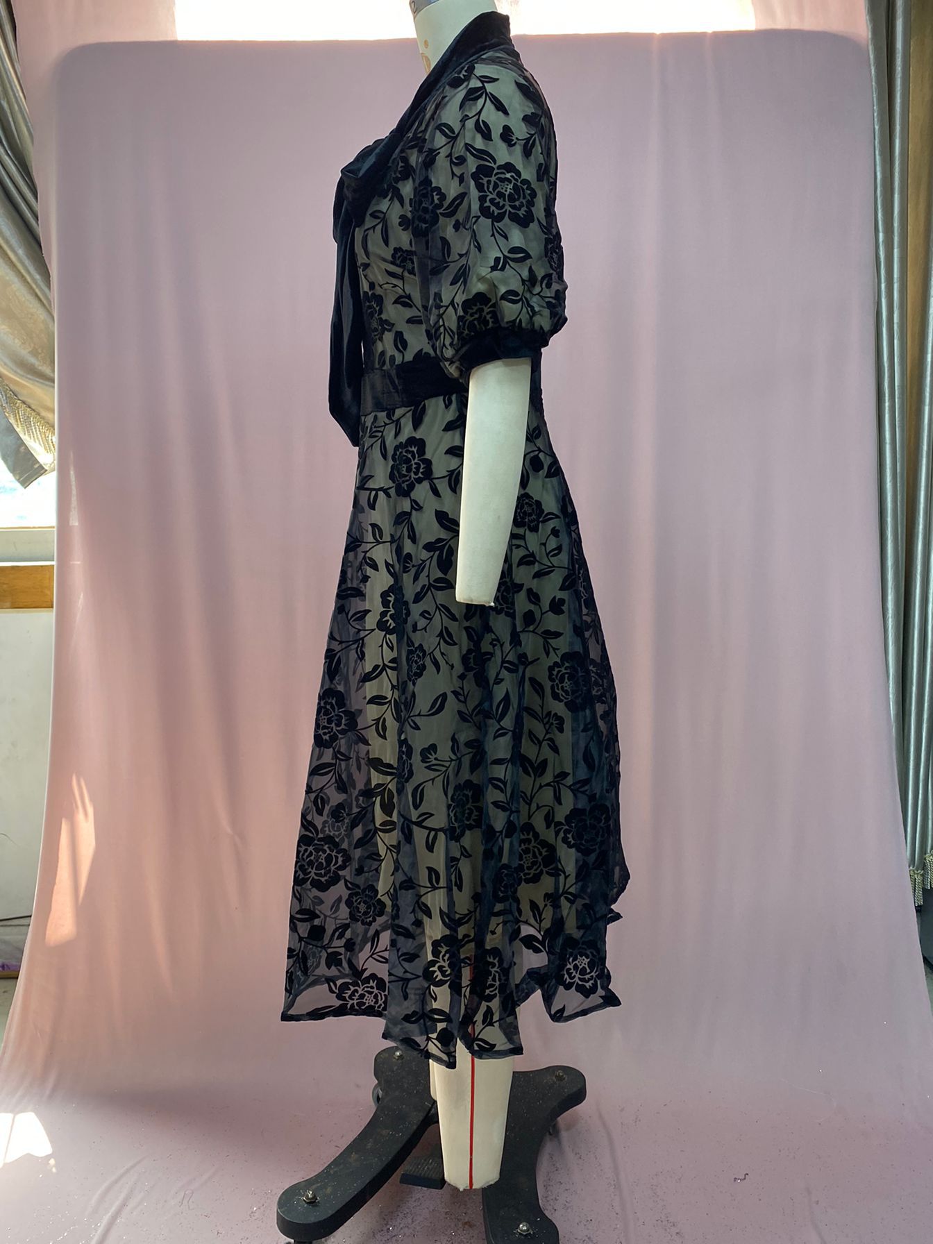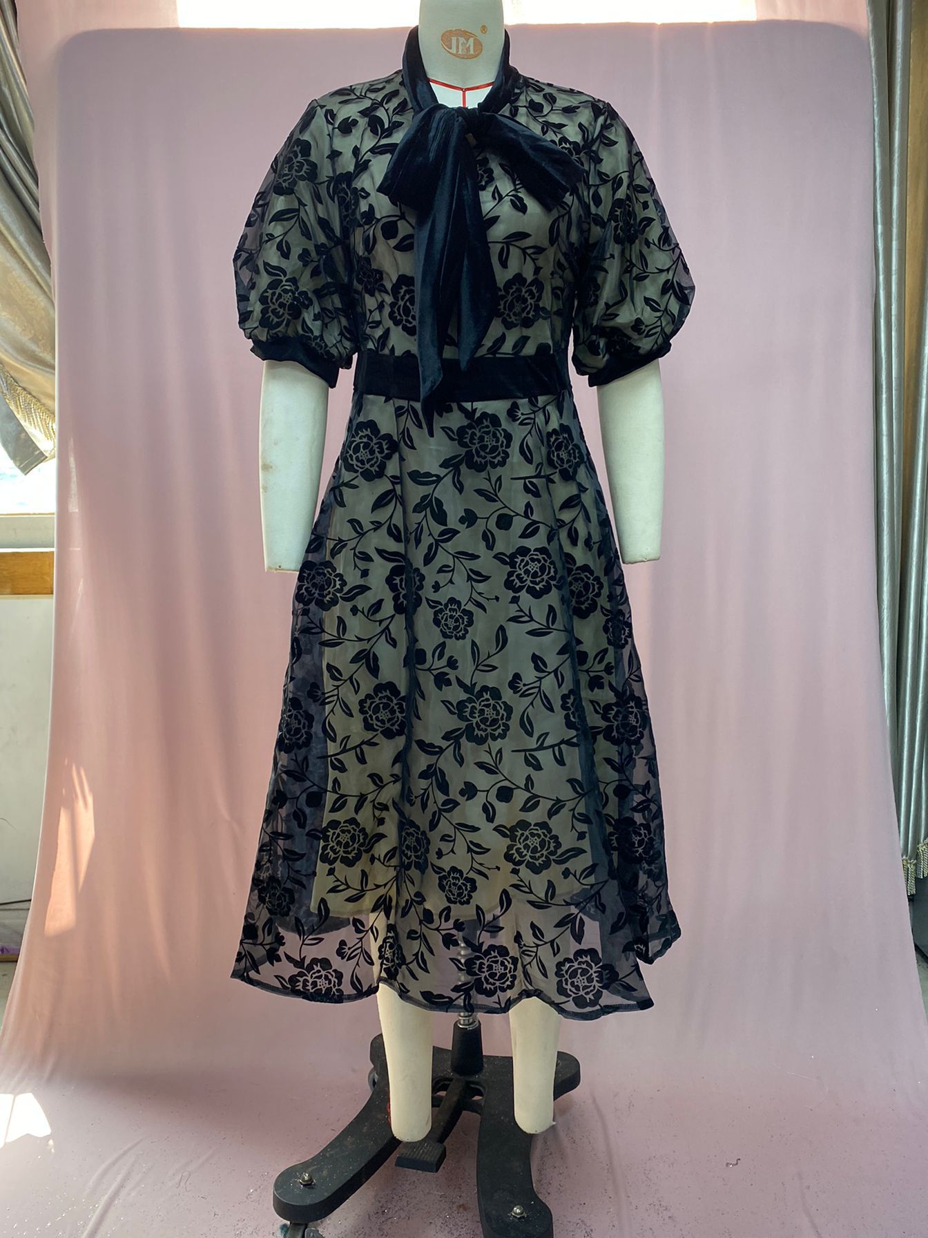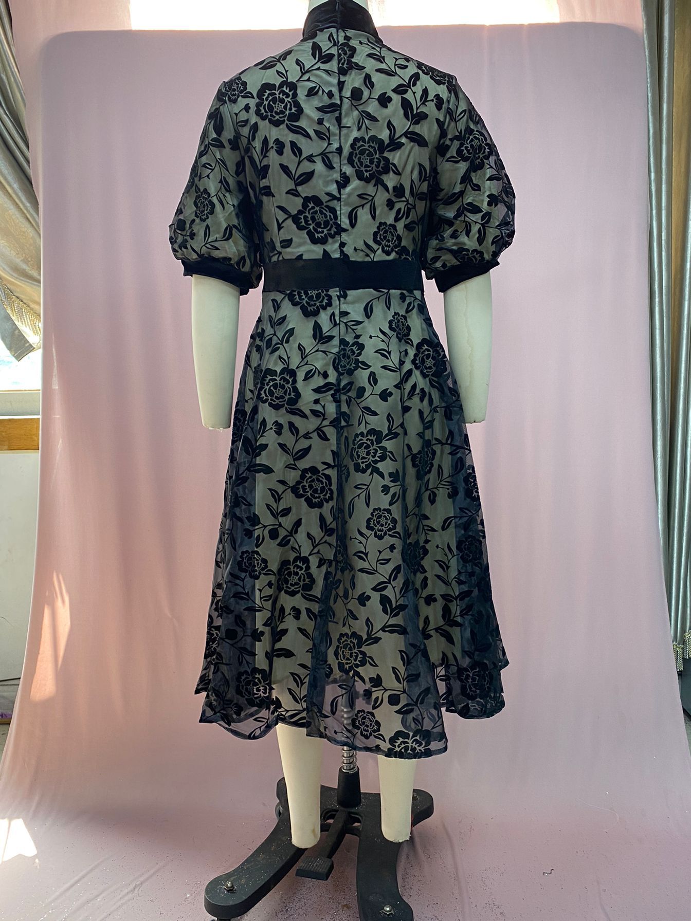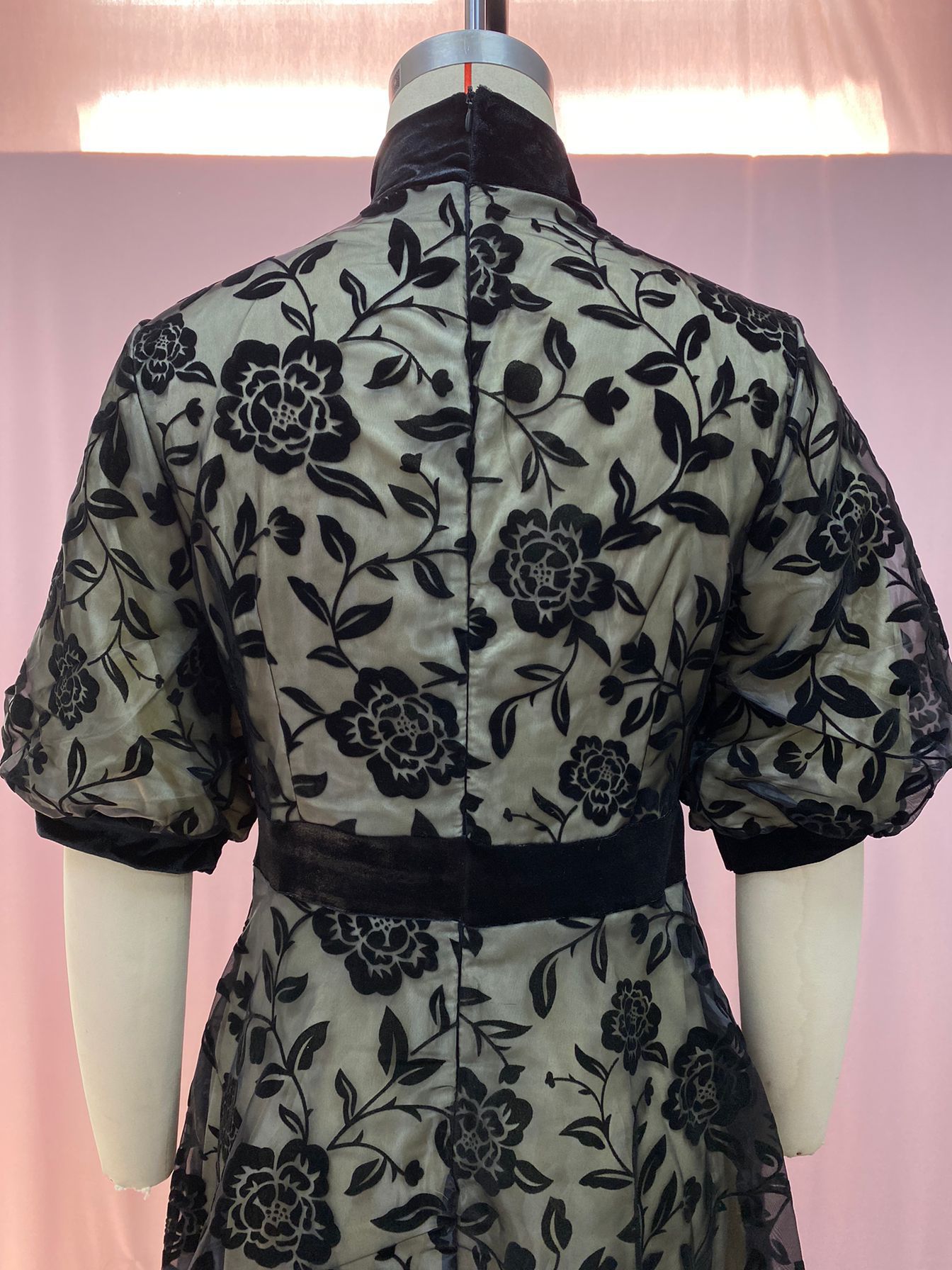 Summer Graceful Stand Collar Black Flocking Encryption Mesh Cinched Lace Stitching Slimming Dress