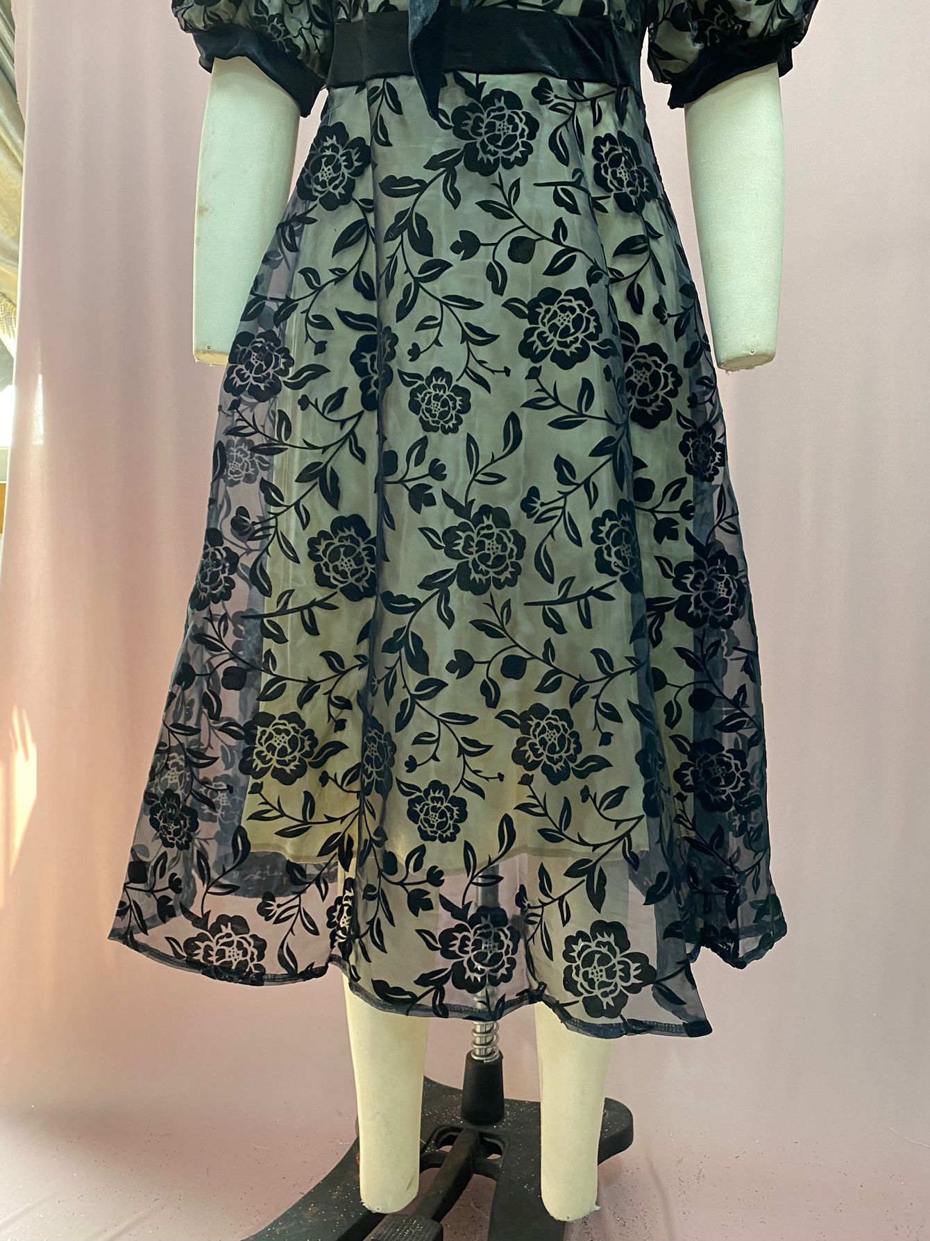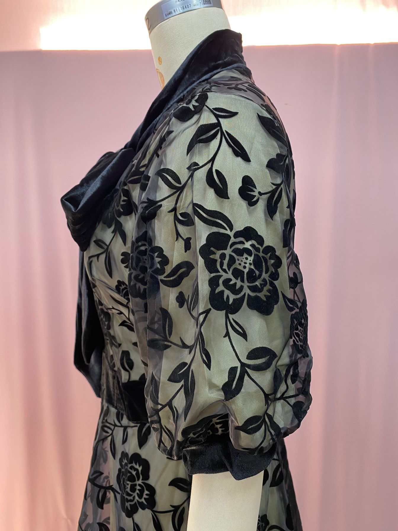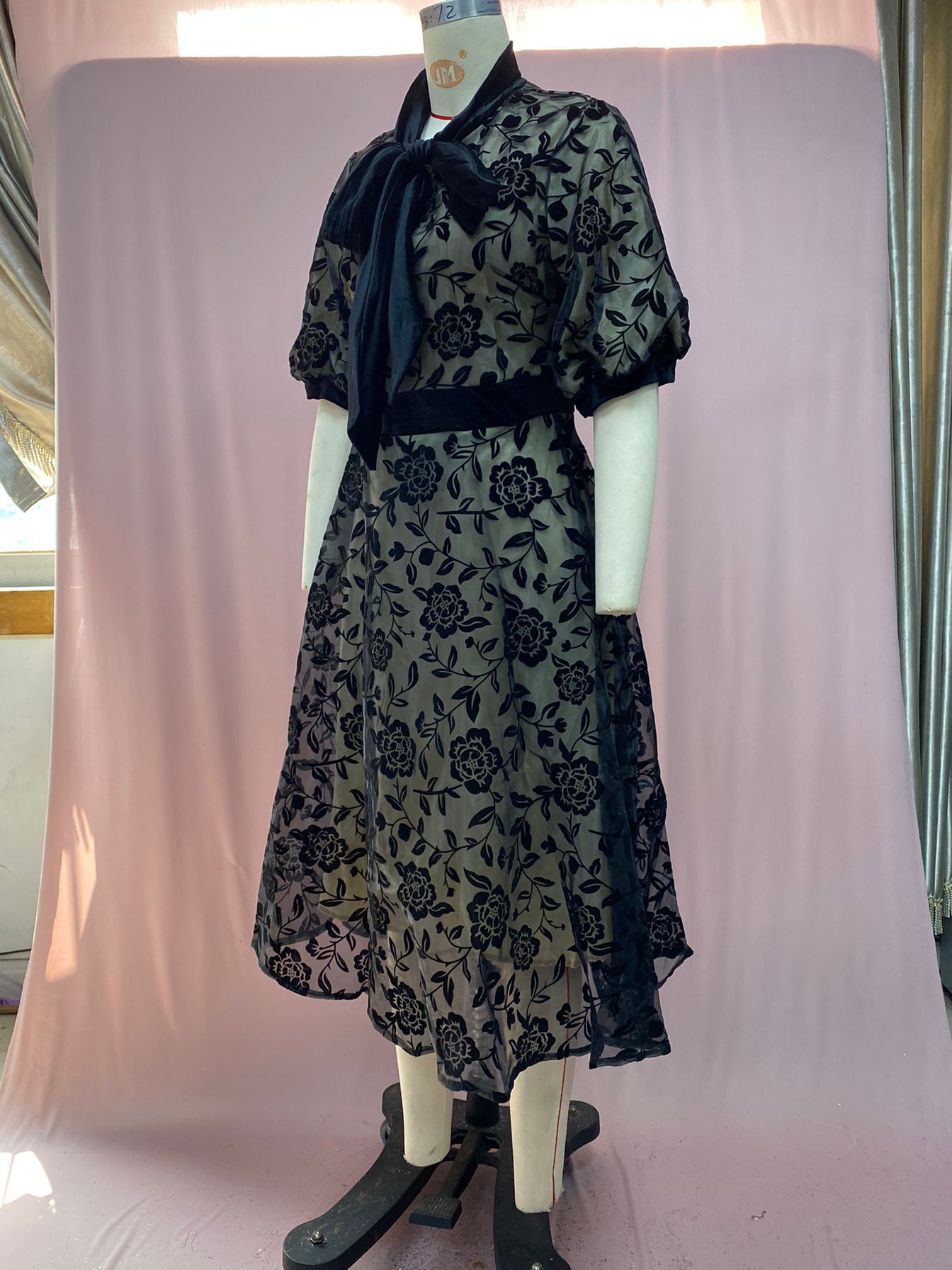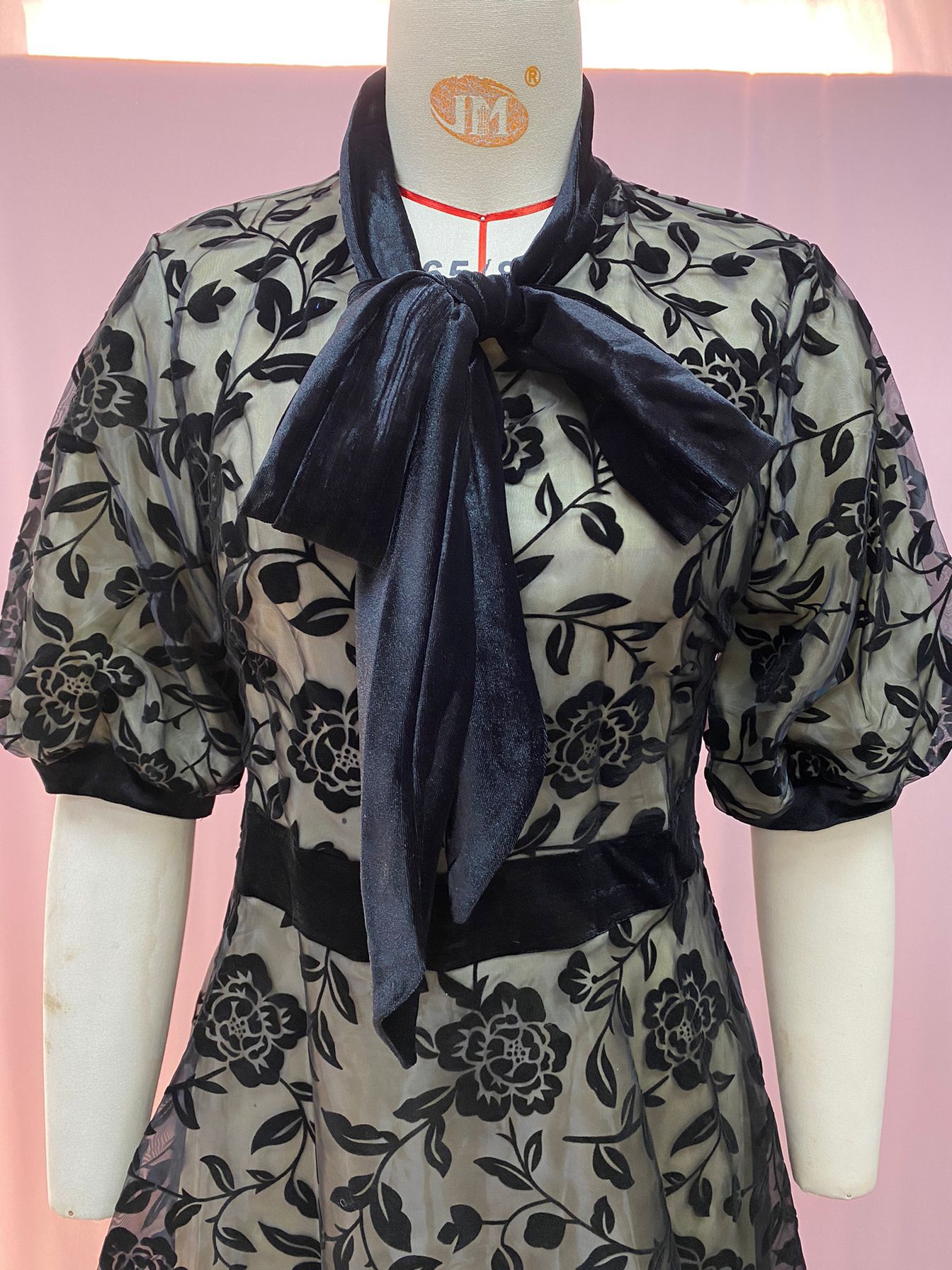 Summer Graceful Stand Collar Black Flocking Encryption Mesh Cinched Lace Stitching Slimming Dress