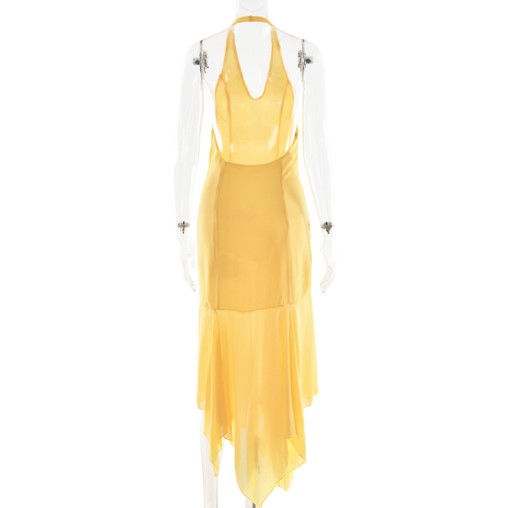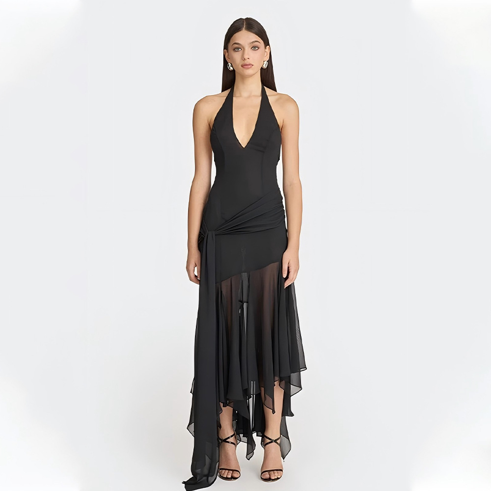 Summer Halter Chiffon See through Dress Sexy Deep V Plunge Ribbon Dress