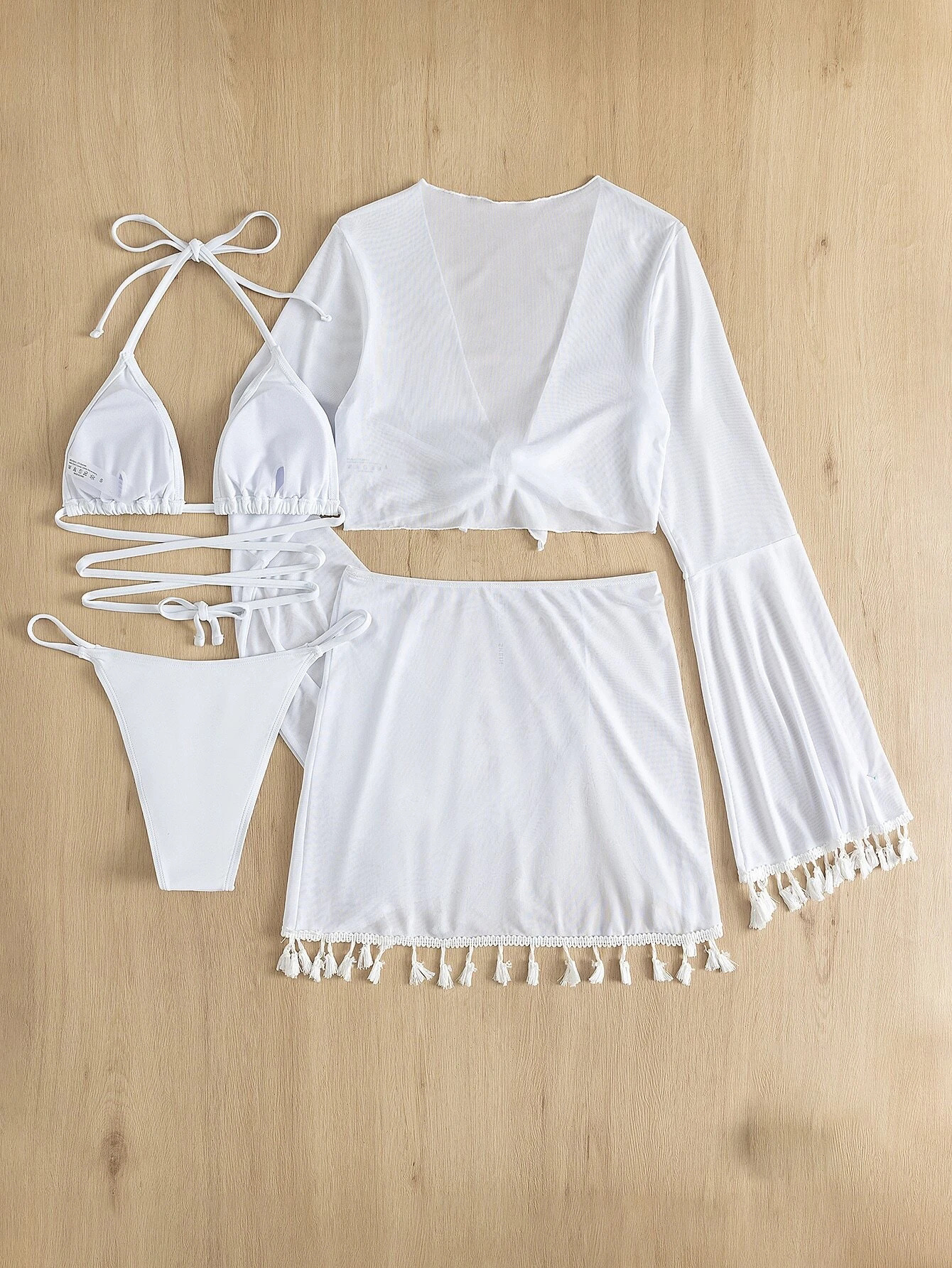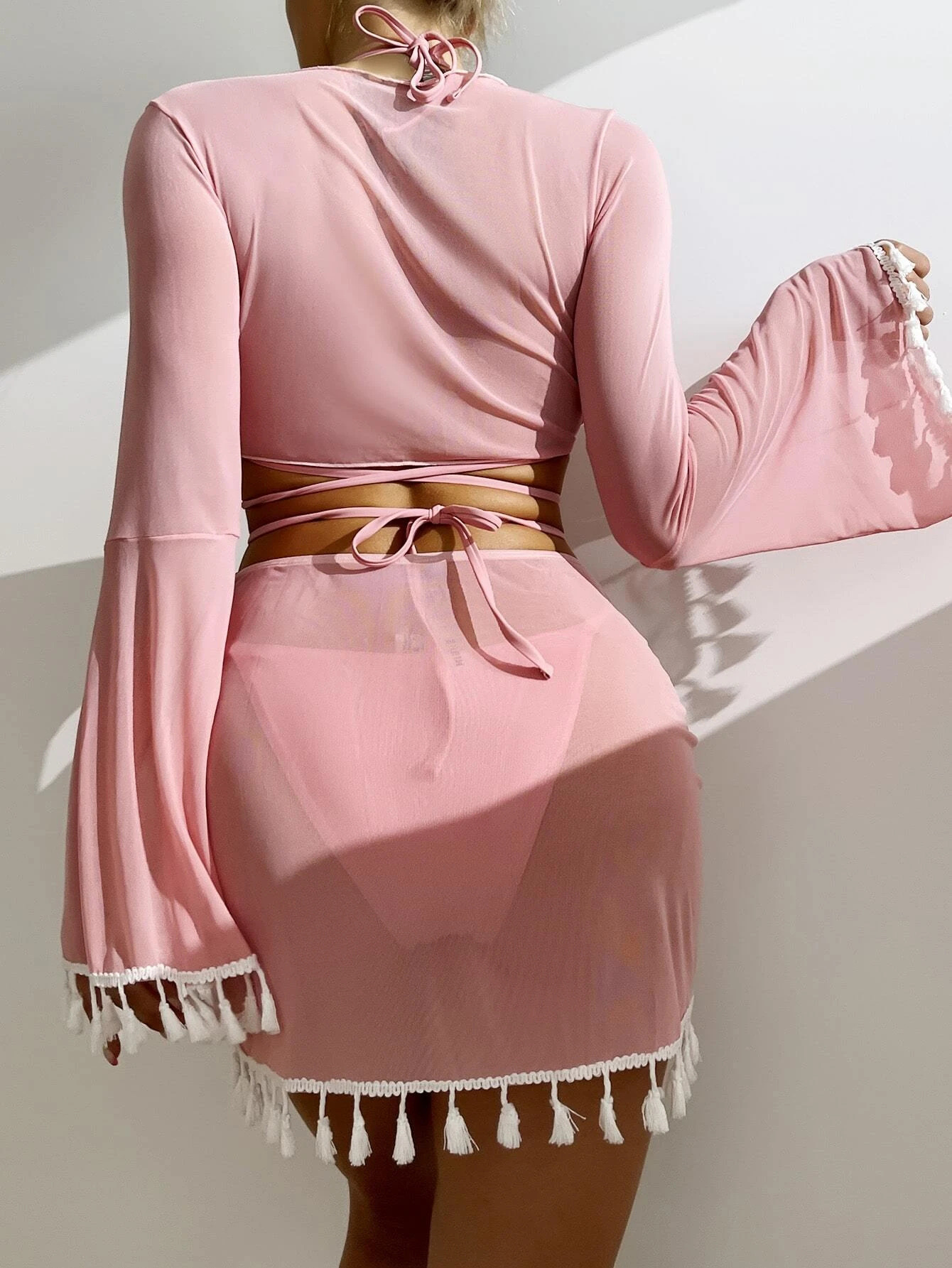Swimsuit Women Split Three Or Four Piece Suit Solid Color Tassel Lace Up Long Sleeve Internet Celebrity Suit