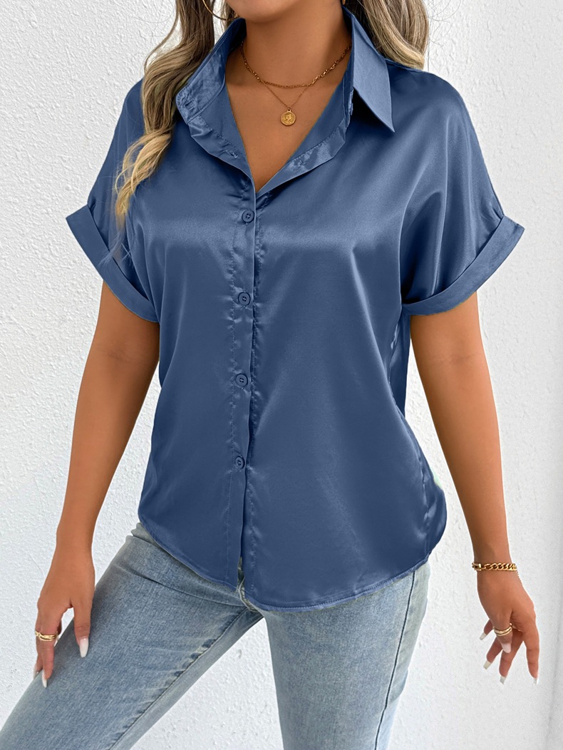 Women Clothes Summer Blue Color Satin Shirt Women Satin Shirt