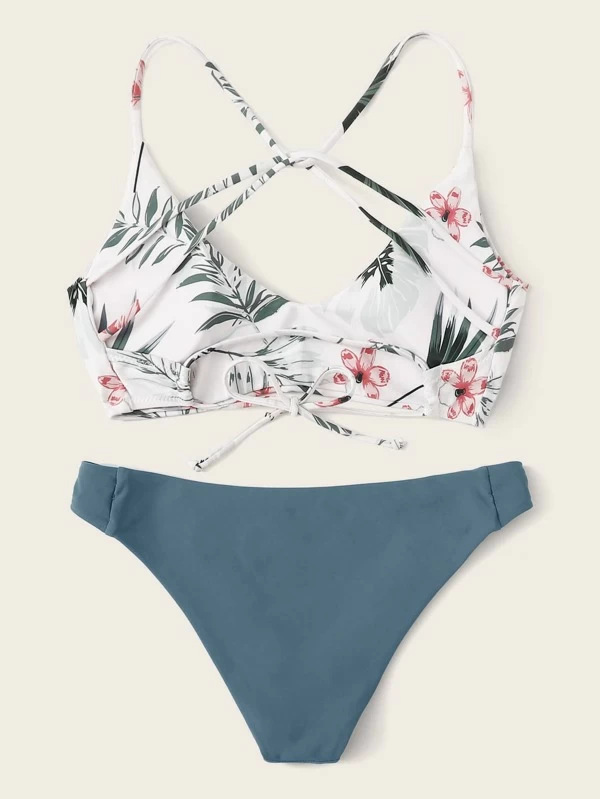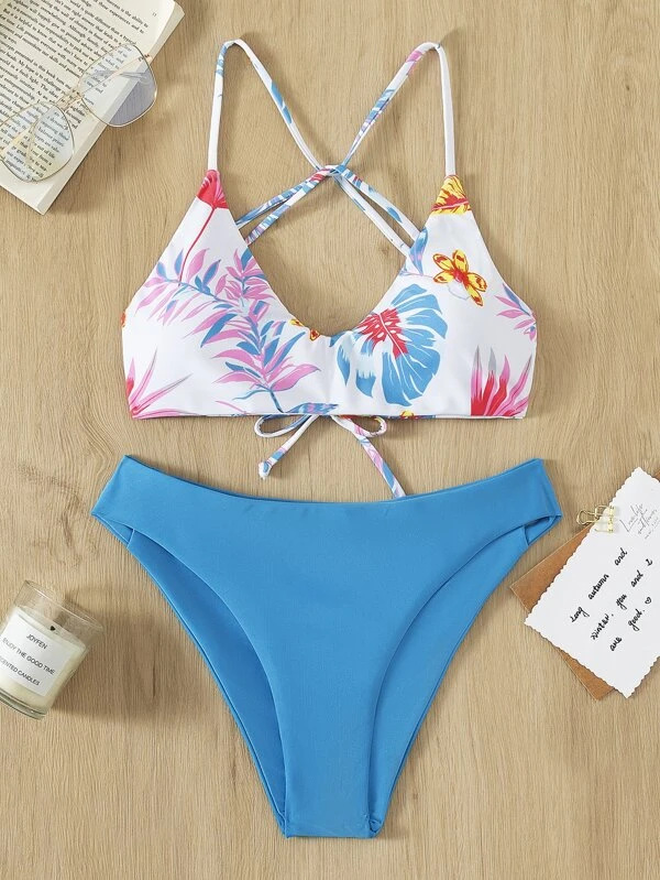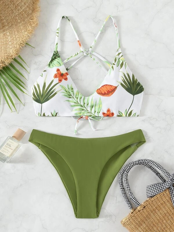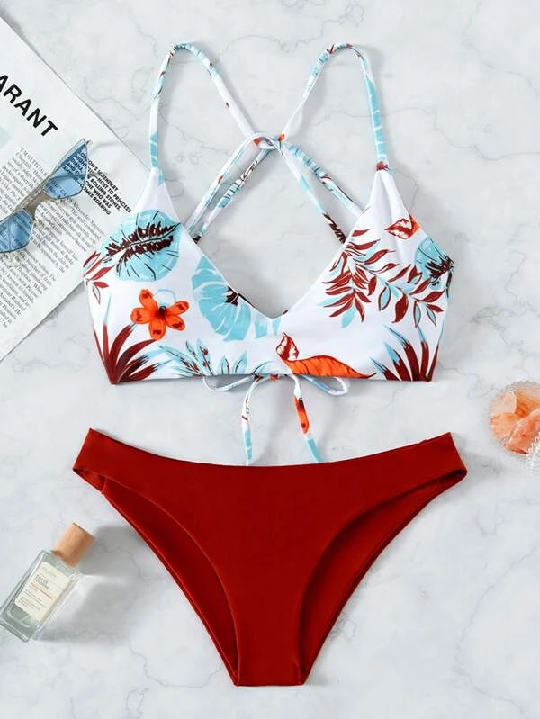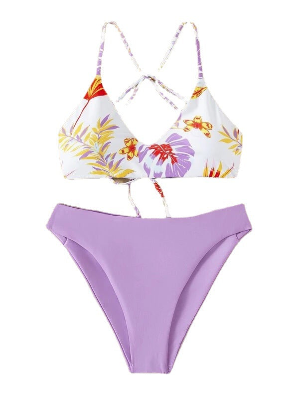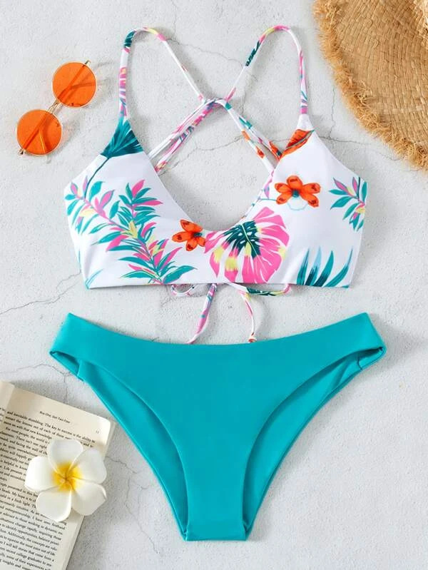Traje de baño de bikini con estampado floral cruzado y abertura en forma de U, traje de baño decorativo con marea para nadar