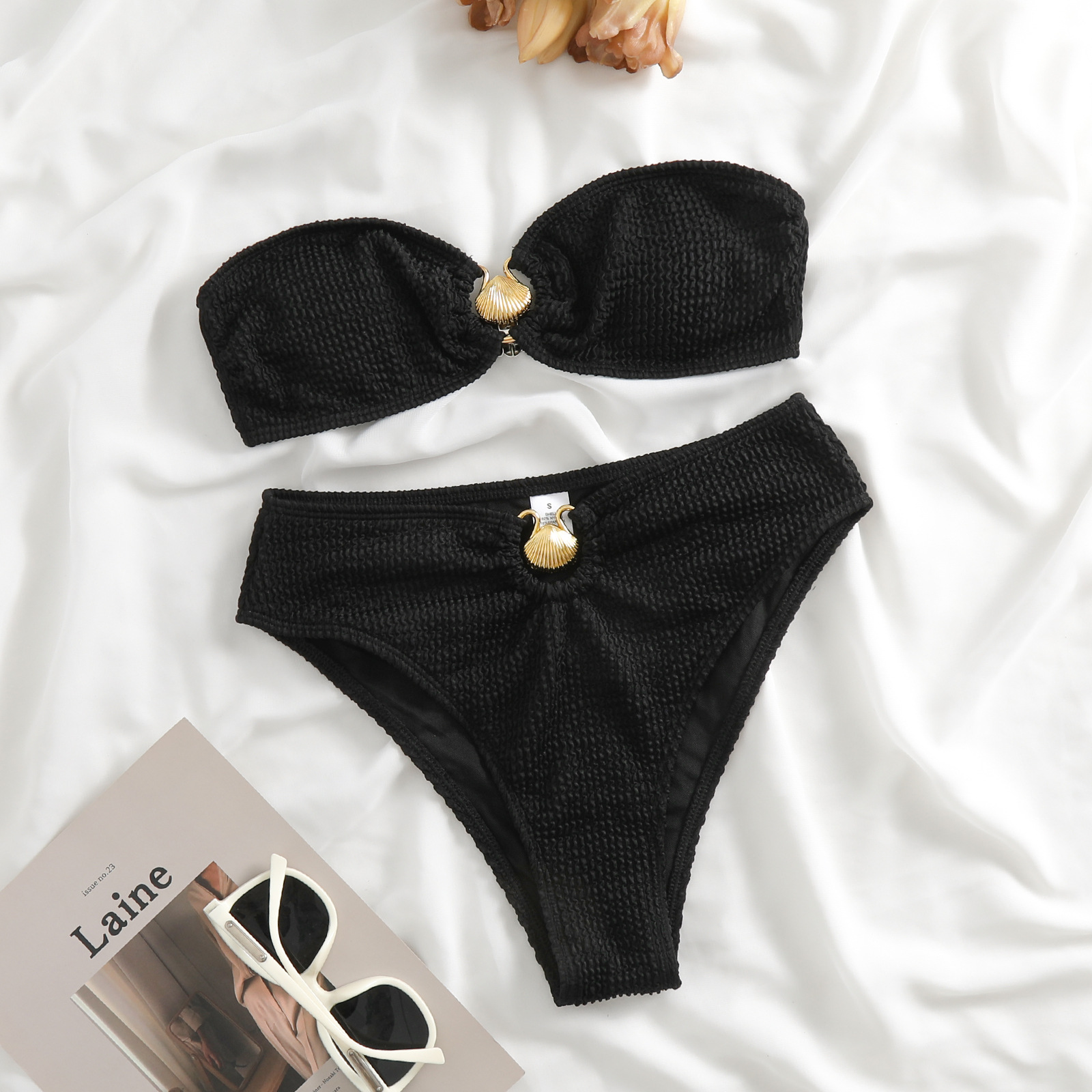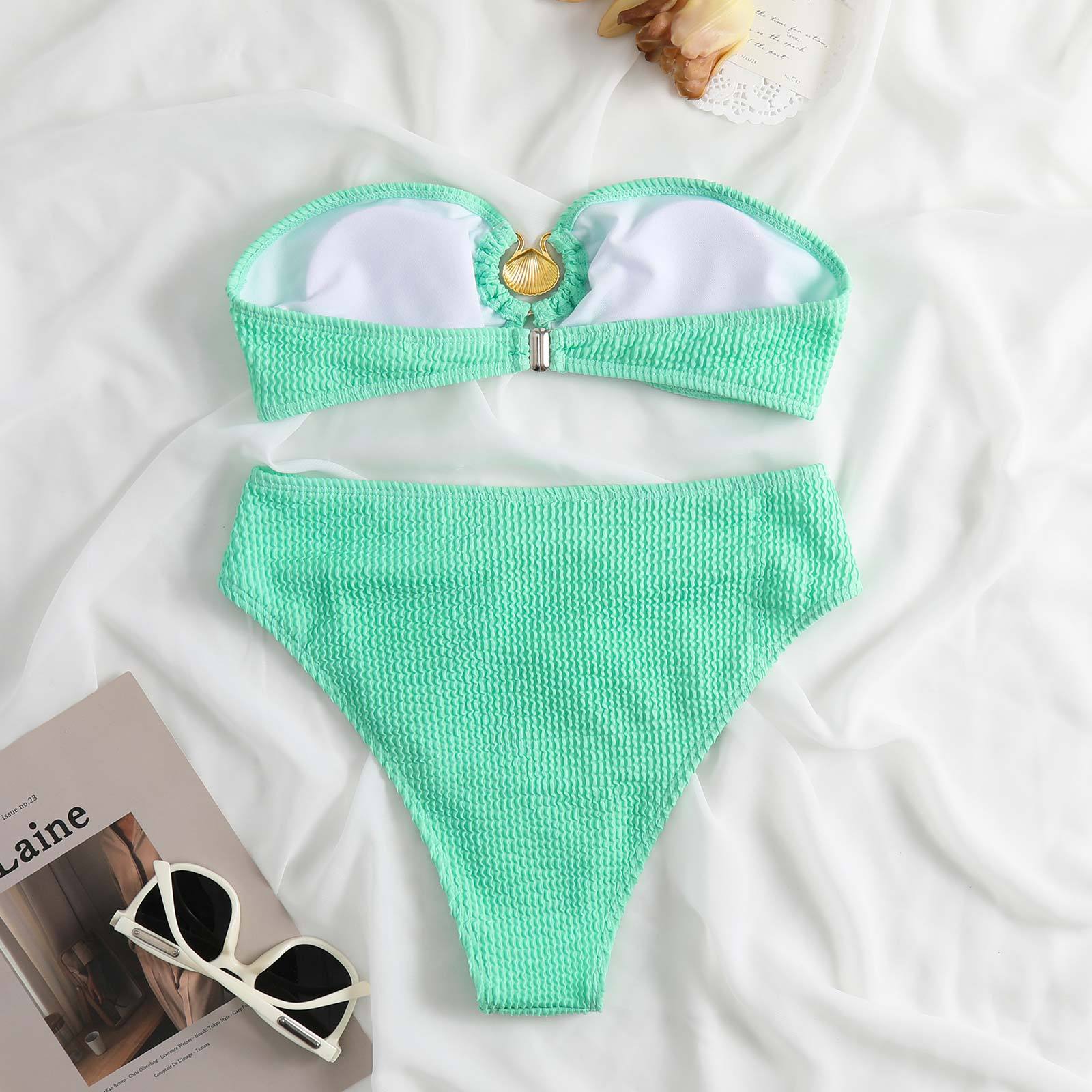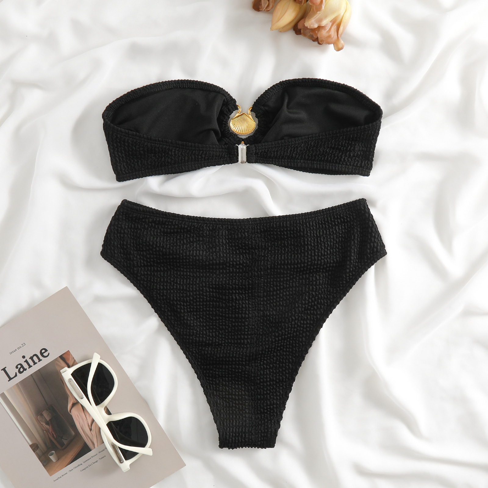 Traje de baño de bikini liso de color contrastante para mujer con estampado de ondas y abertura