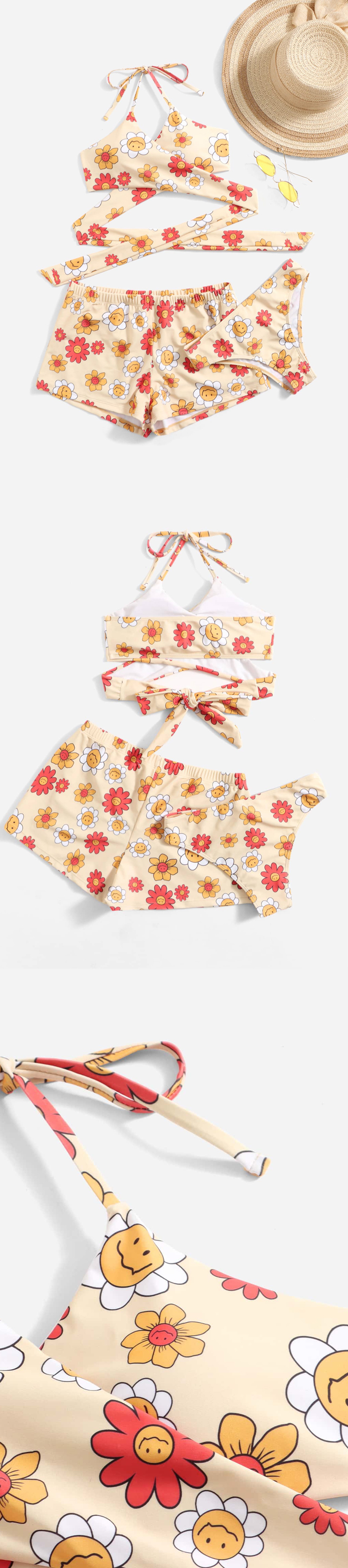 Traje de baño de tres piezas para mujer, estampado, sexy, con cordones y pantalones cortos divididos.
