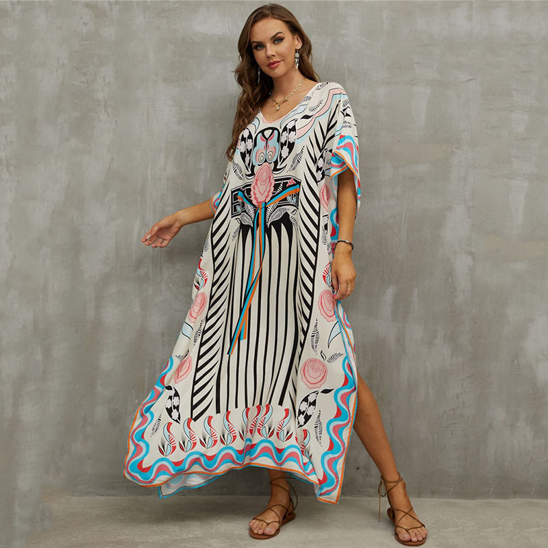 Bata playera con cuello en V y estampado de rayón, falda de vacaciones, cubierta de bikini