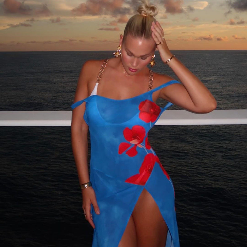 Vestido maxi sexy de verano con abertura y estampado sin espalda para mujer
