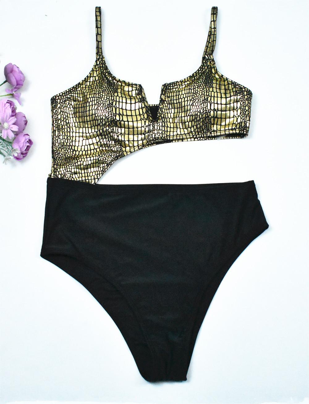 Traje de baño sexy de tela especial con costuras de piel de serpiente en dorado y negro para mujer