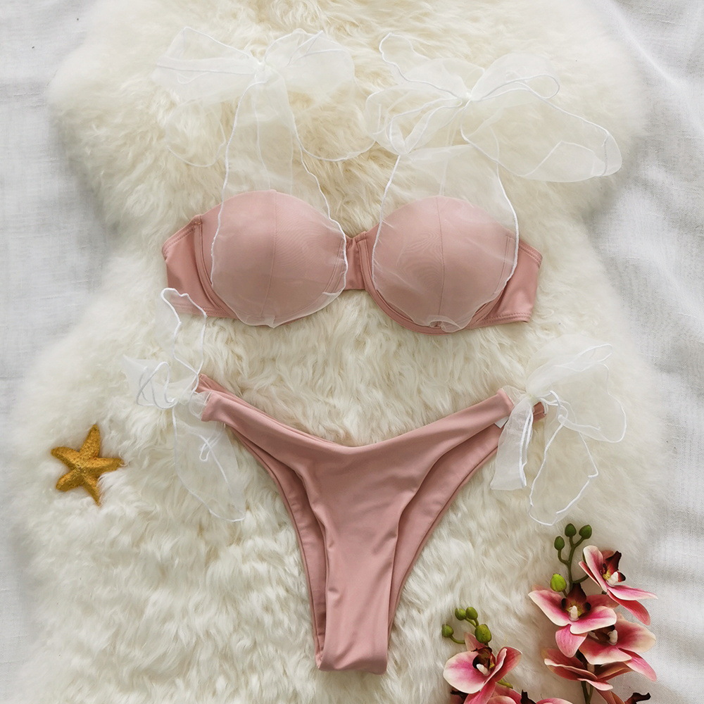 Traje de baño de malla de color sólido con tirantes divididos para mujer, bikini sexy fresco sin espalda