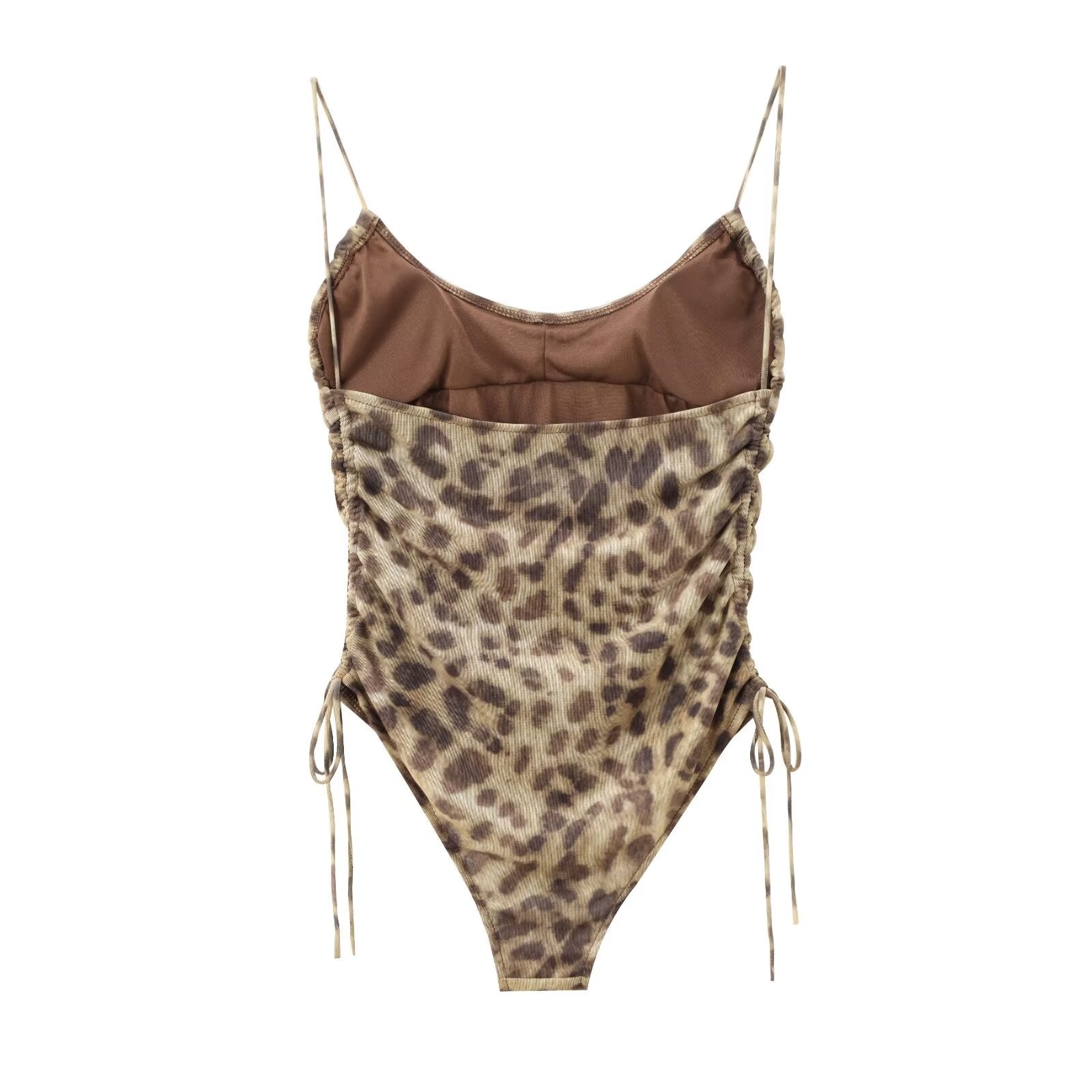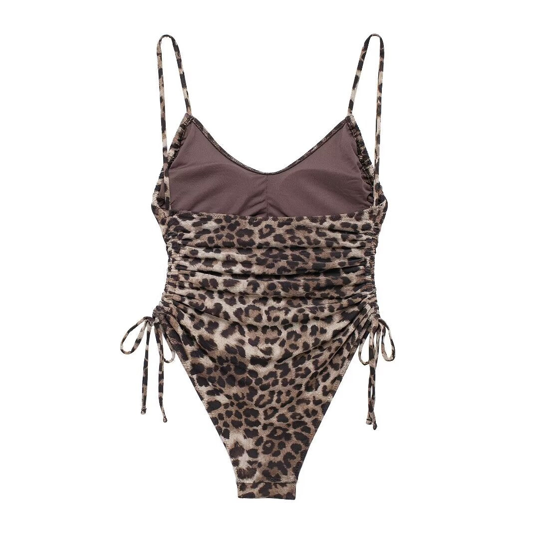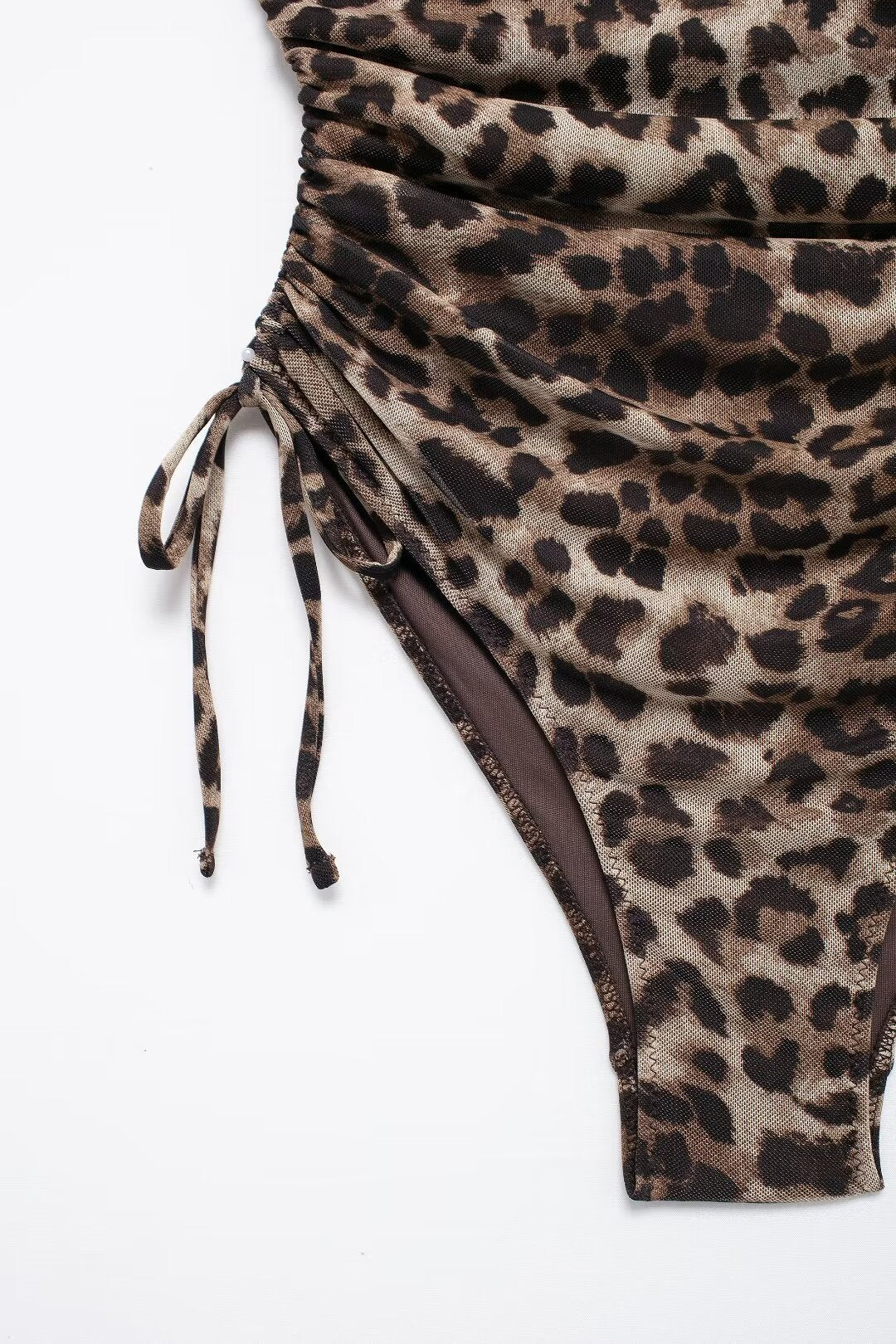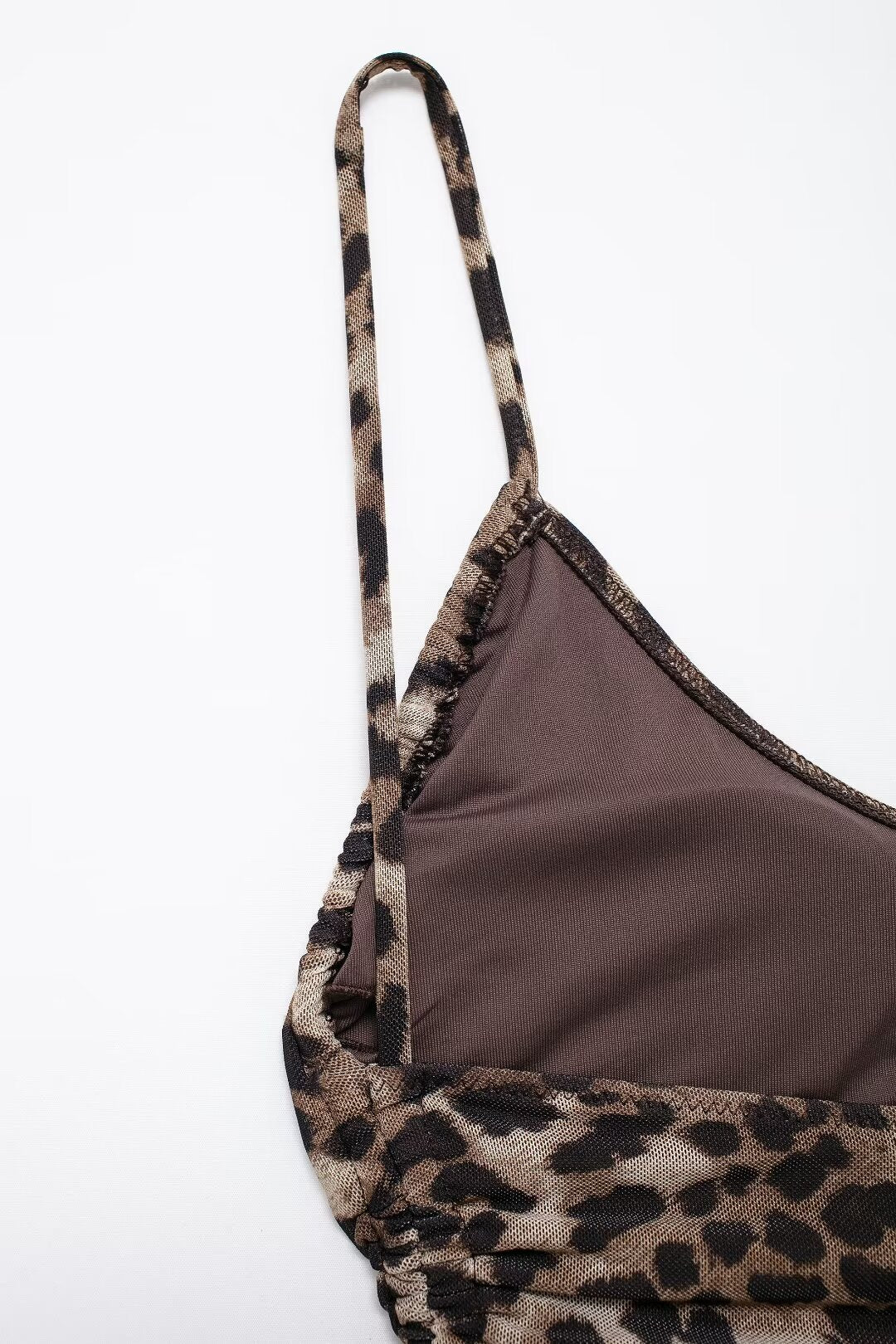 Traje de baño ajustado con decoración plisada de red de seda con estampado de animales de verano