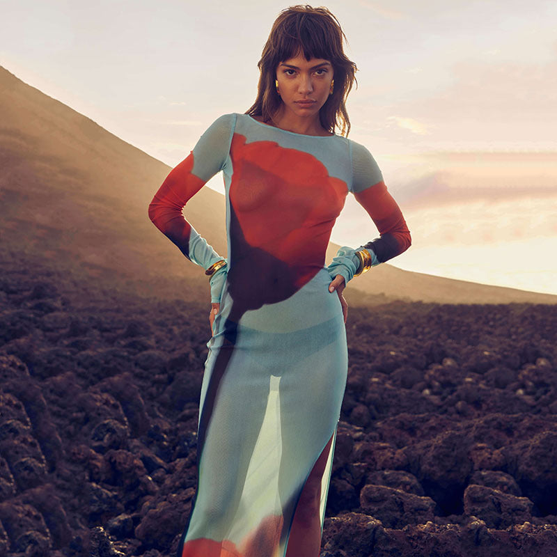Vestido de verano con cuello redondo y estampado de malla sexy para mujer