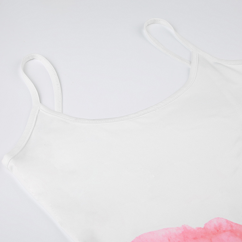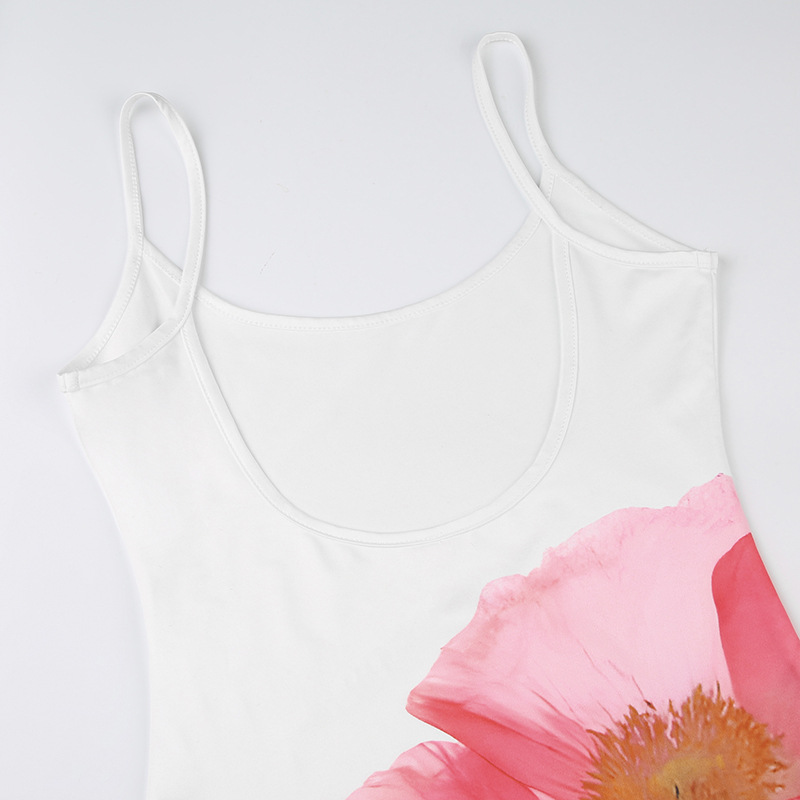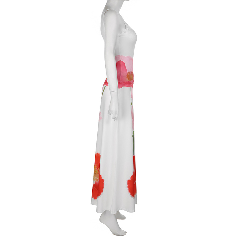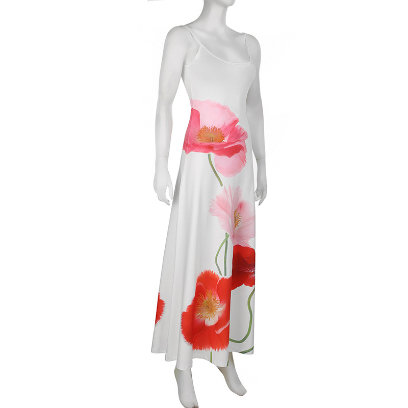 Vestido largo de verano con estampado floral grande, tirantes finos en contraste de color, espalda descubierta, corte A, para playa
