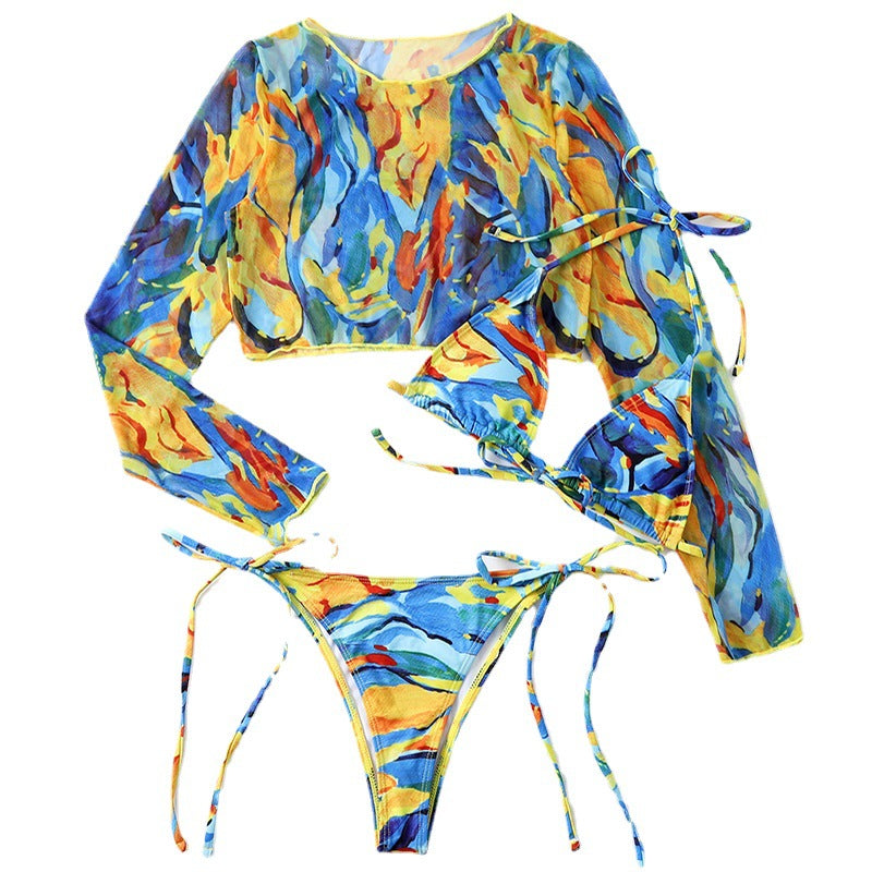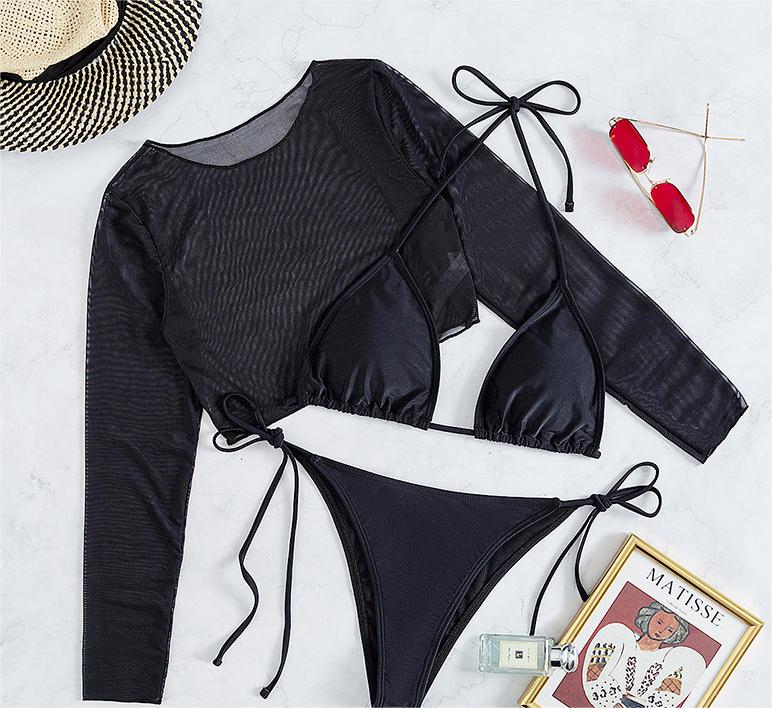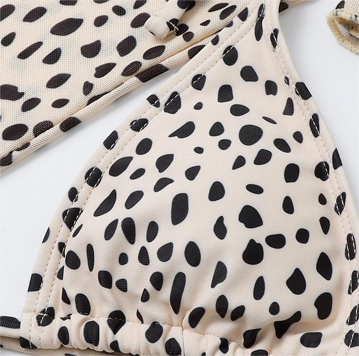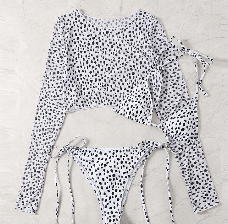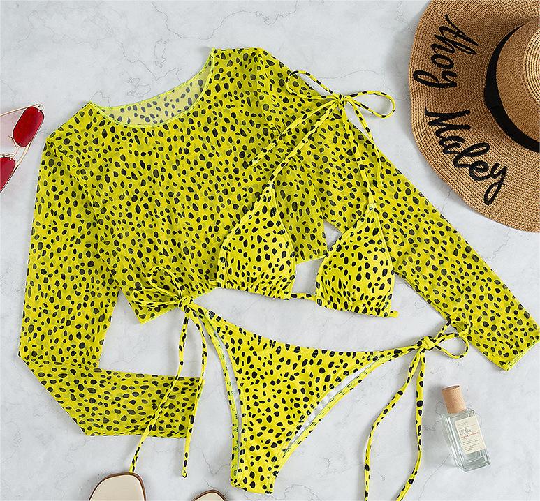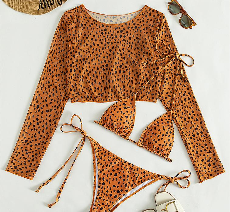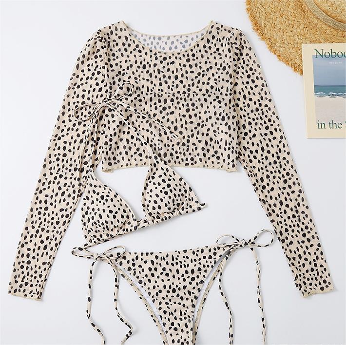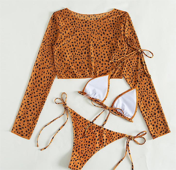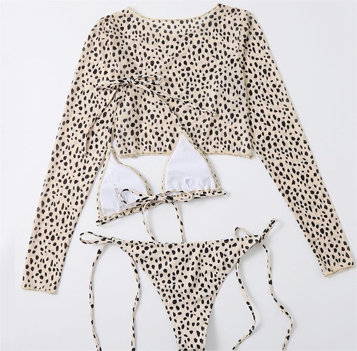 Traje de baño de manga larga con cubierta de malla para mujer, conjunto de tres piezas, traje de baño con estampado de leopardo, bikini sexy de cuerda