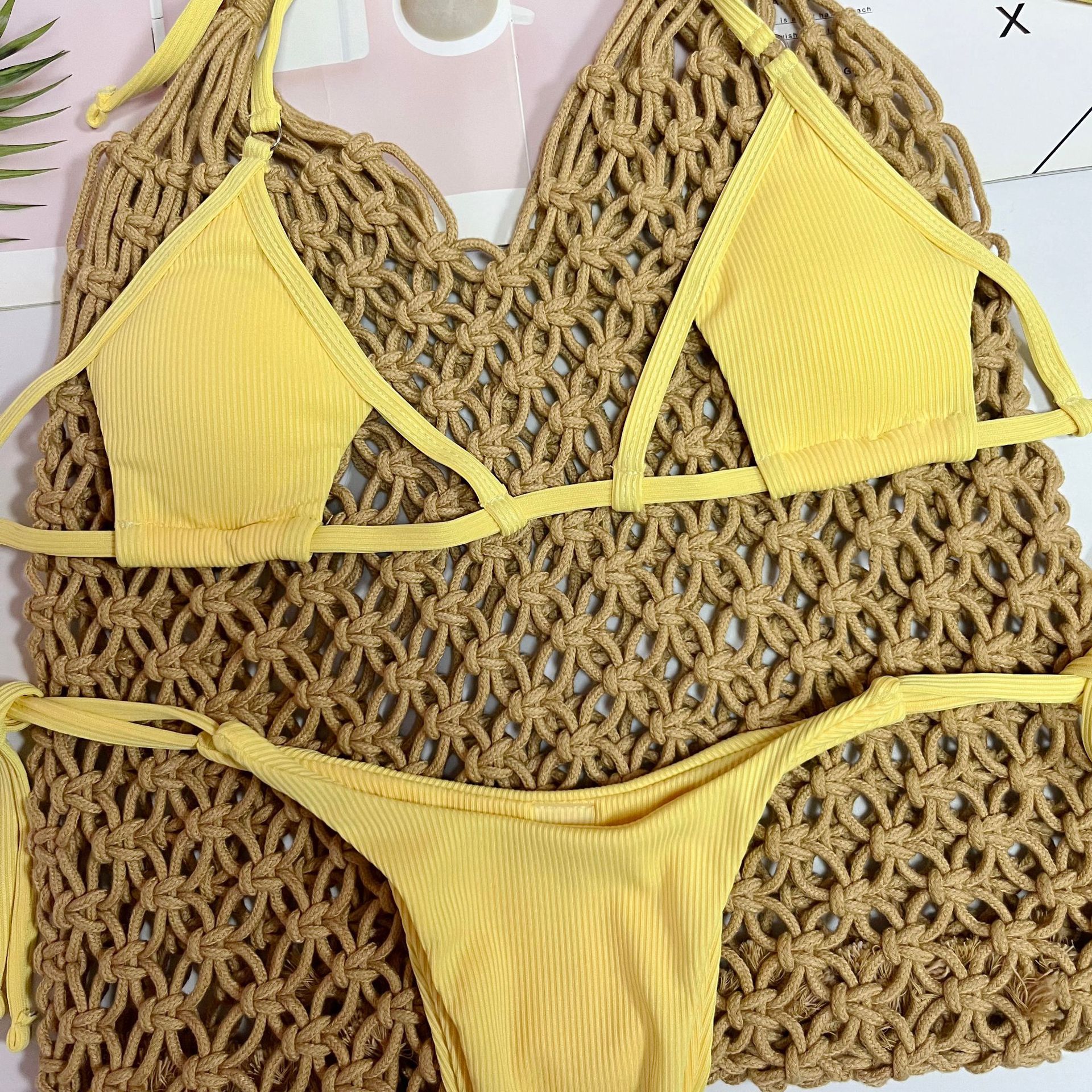 Traje de baño de tela especial con tiras hundidas, traje de baño sexy de tres piezas, bikini para mujer