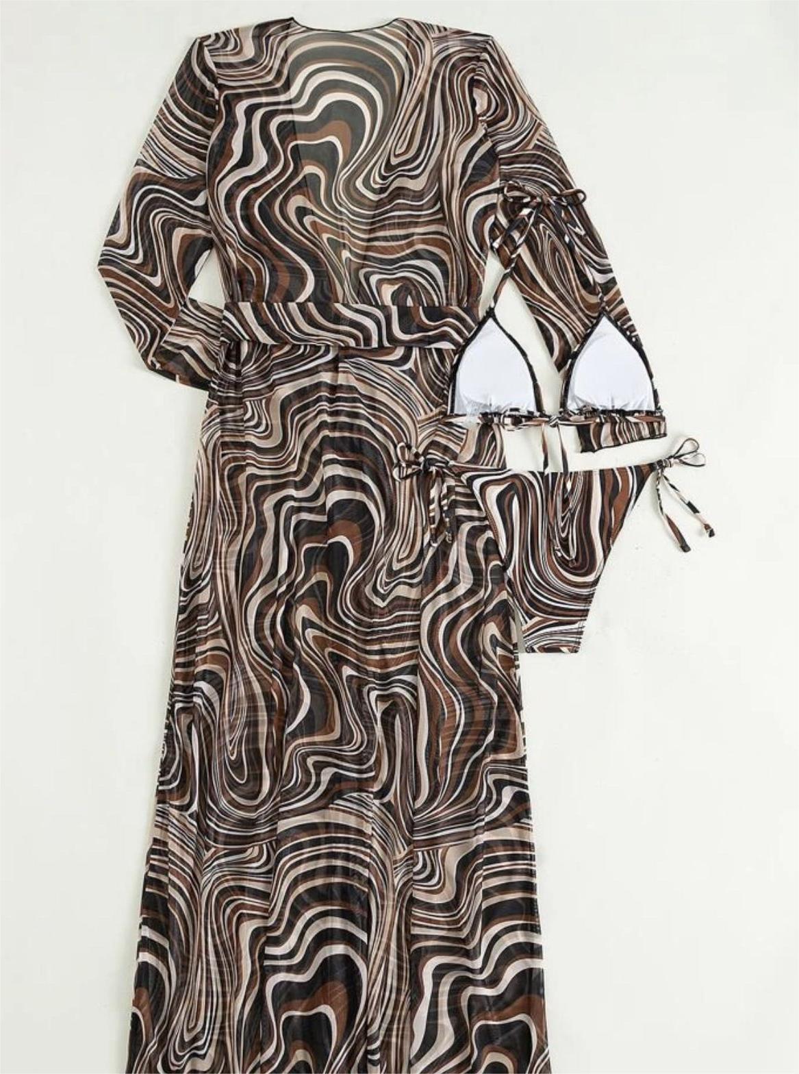 Conjunto de tres piezas de bikini de manga larga de malla con cinturón largo para playa anti-ddos para mujer