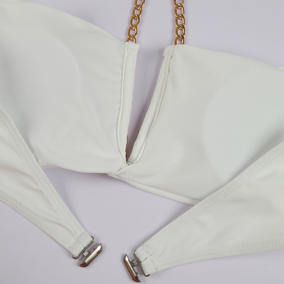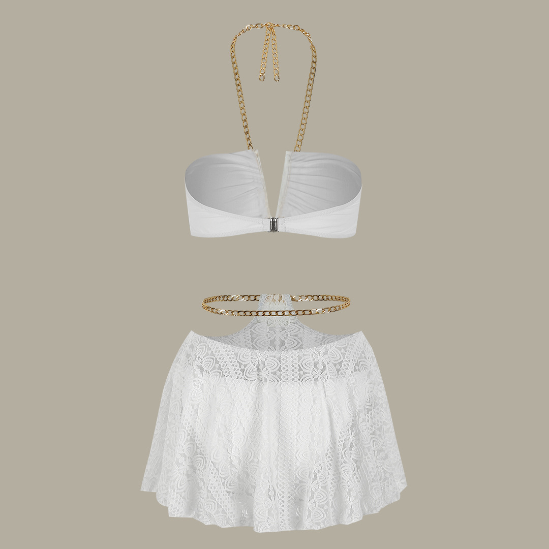 Traje de baño de tres piezas con falda de bikini con tirantes de cadena para mujer, bikini fresco de color puro