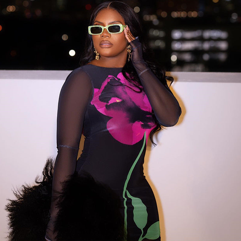 Vestido de mujer con estampado de cuello redondo, malla, manga larga, jersey estrecho