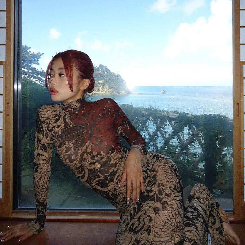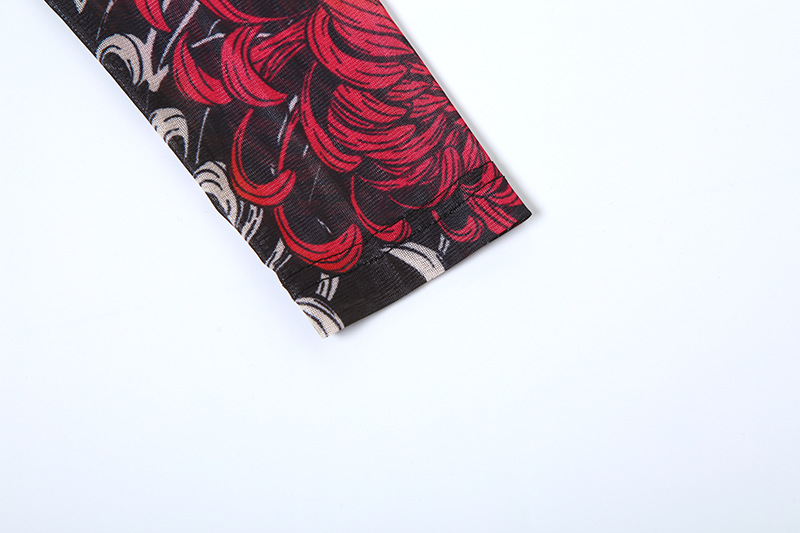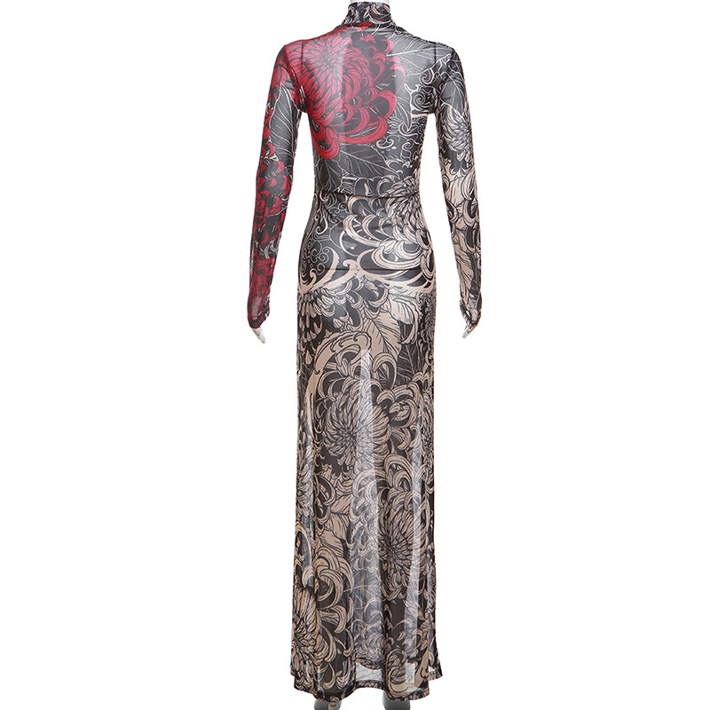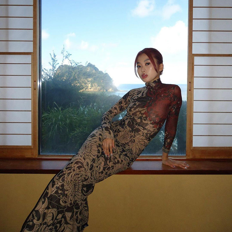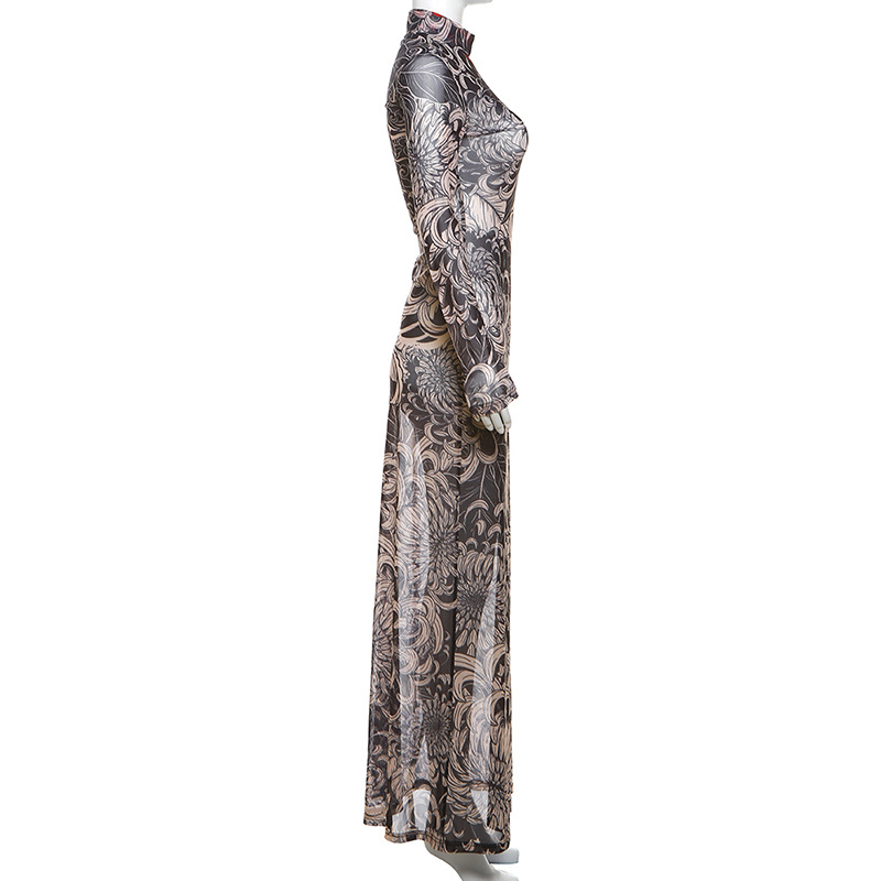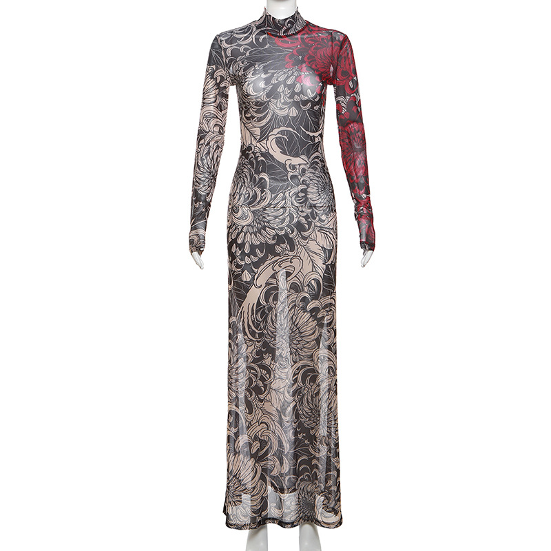Vestido ajustado de cuello alto con estampado personalizado de malla retro de primavera para mujer