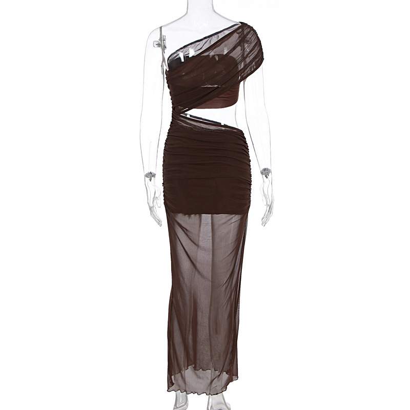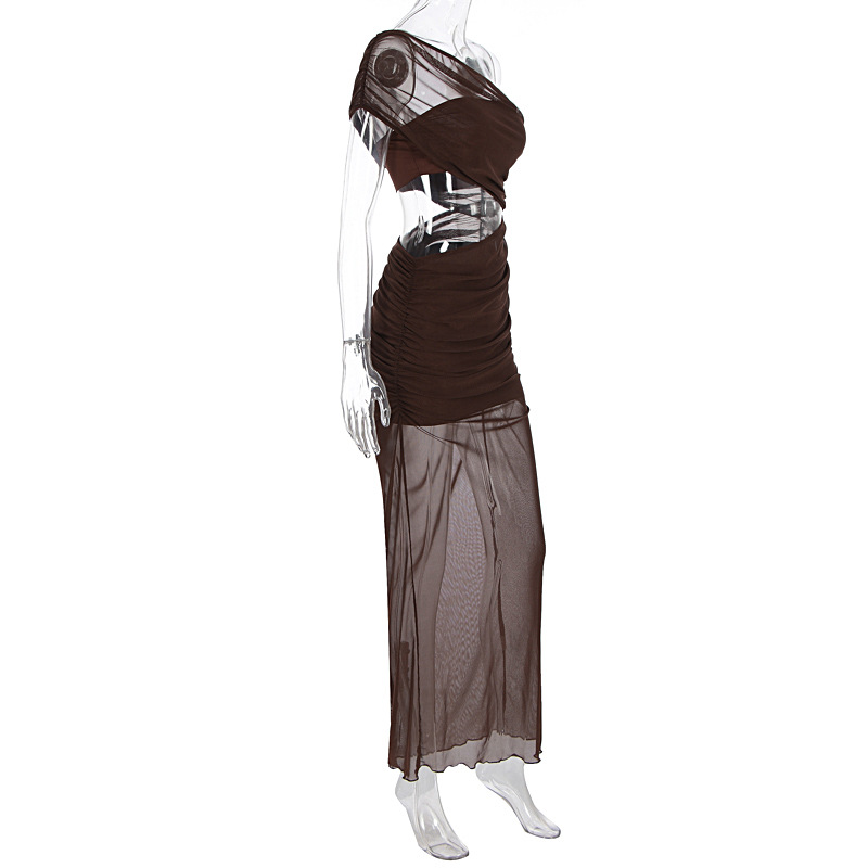 Women Clothing Summer Sexy off Shoulder Gauze Hollow Out Cutout Slim Fit Pleated See through Dress