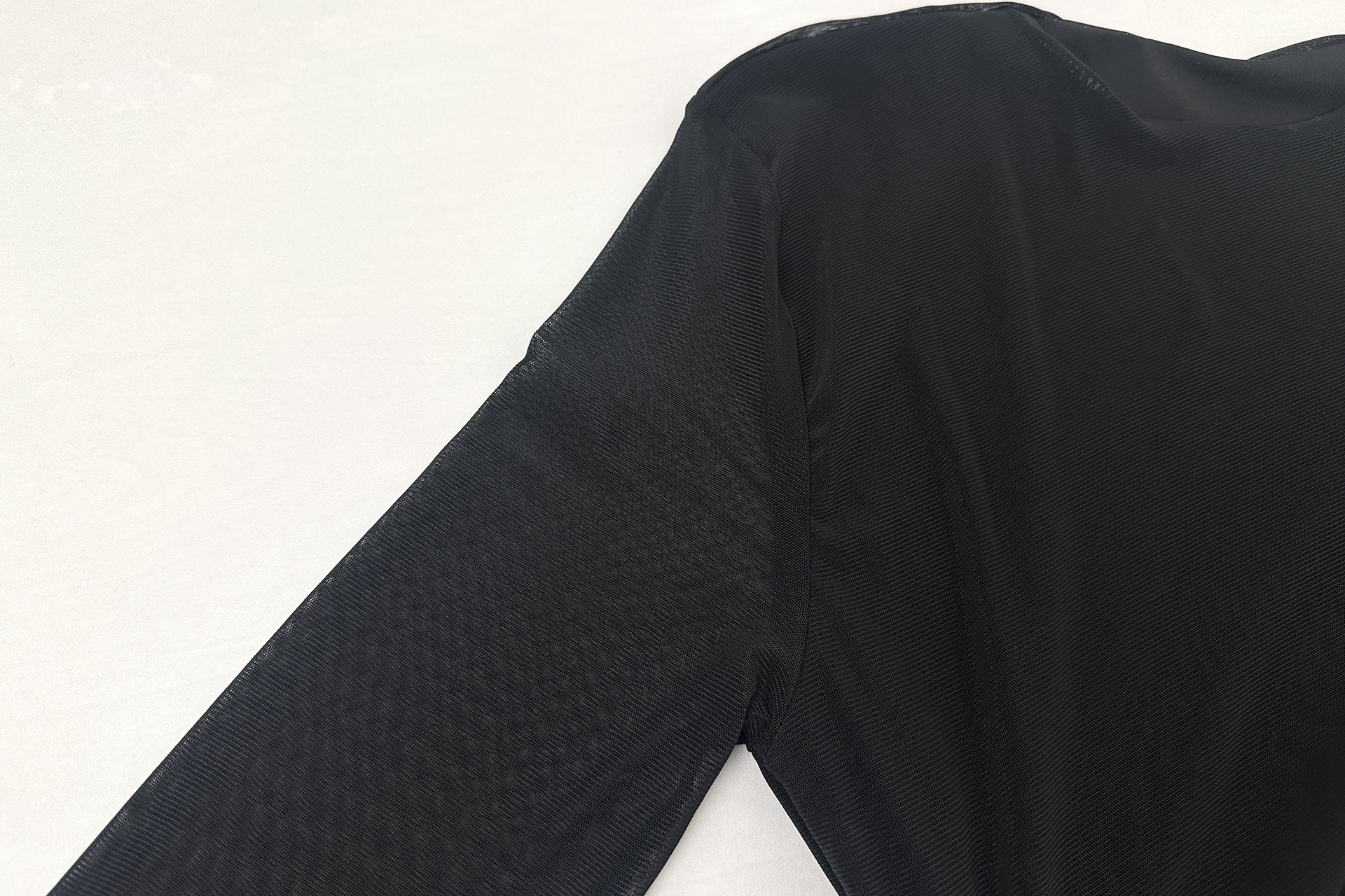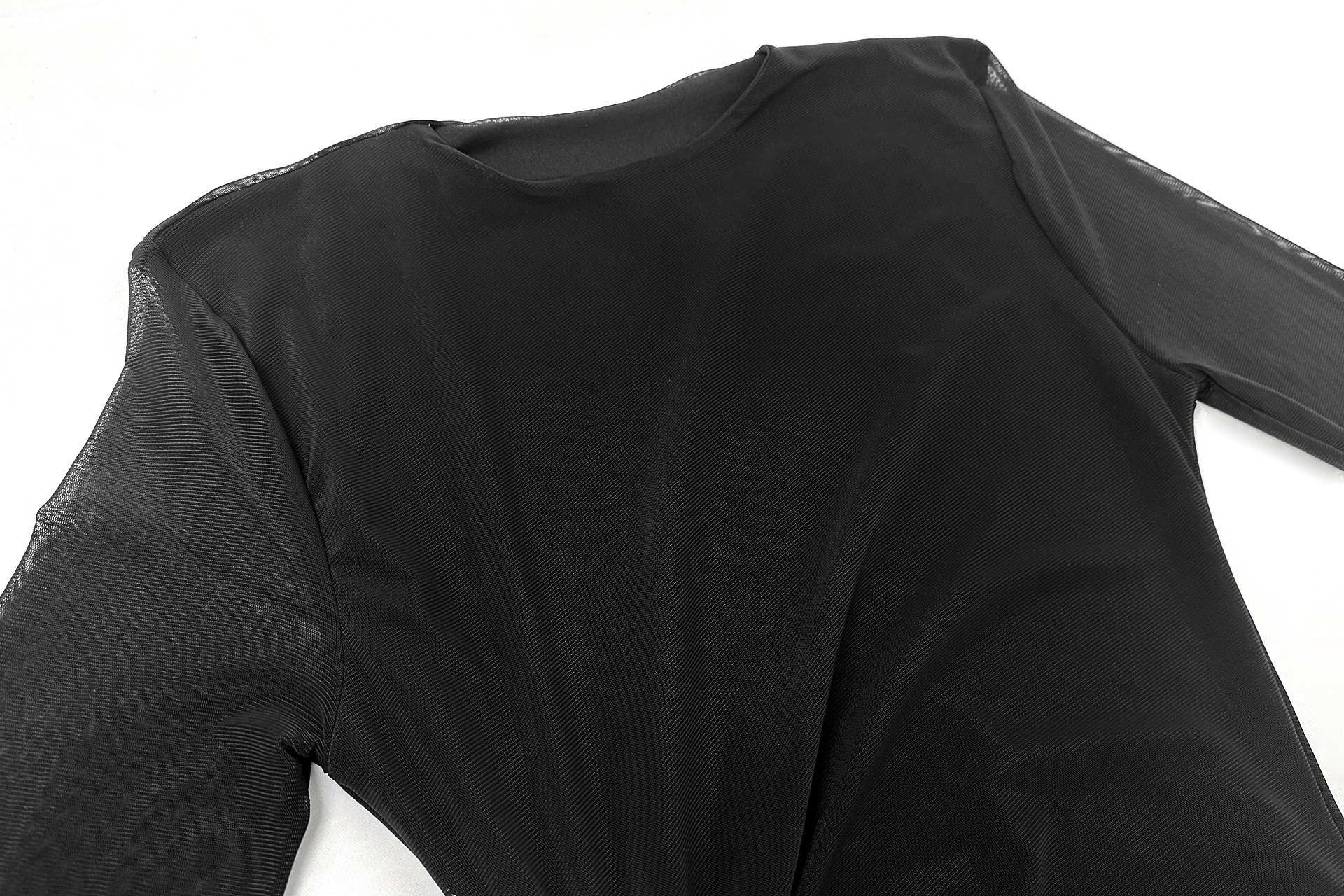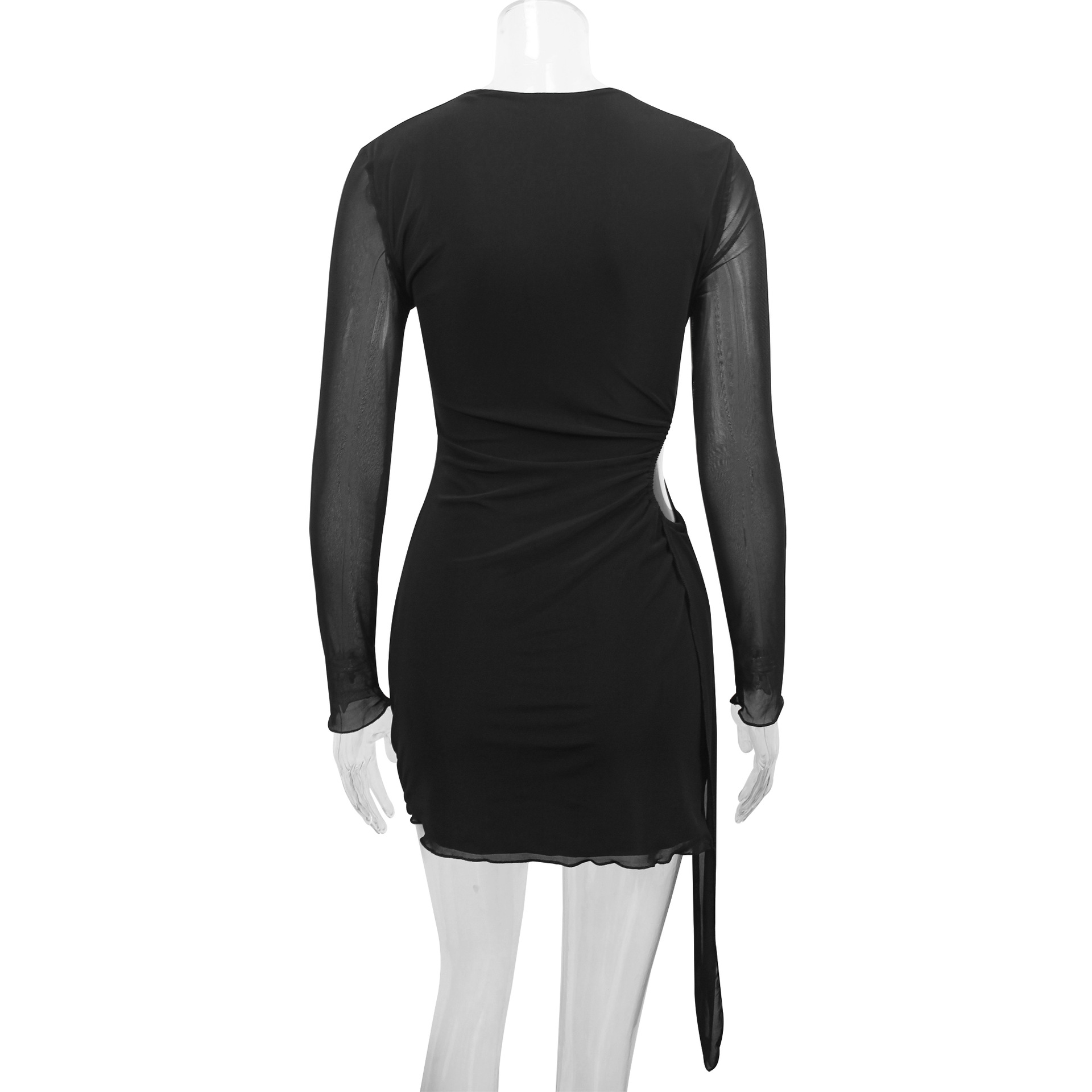 Vestido sexy plisado con cuello redondo y manga larga de malla para mujer
