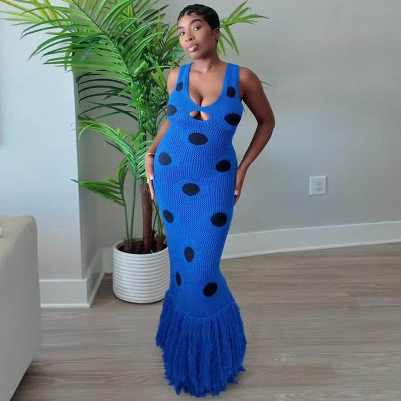 Autumn Sexy Hip Knitwear Dress Black Polka Dot Dress Swing Tassel Dress
