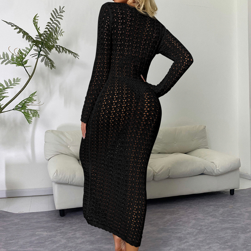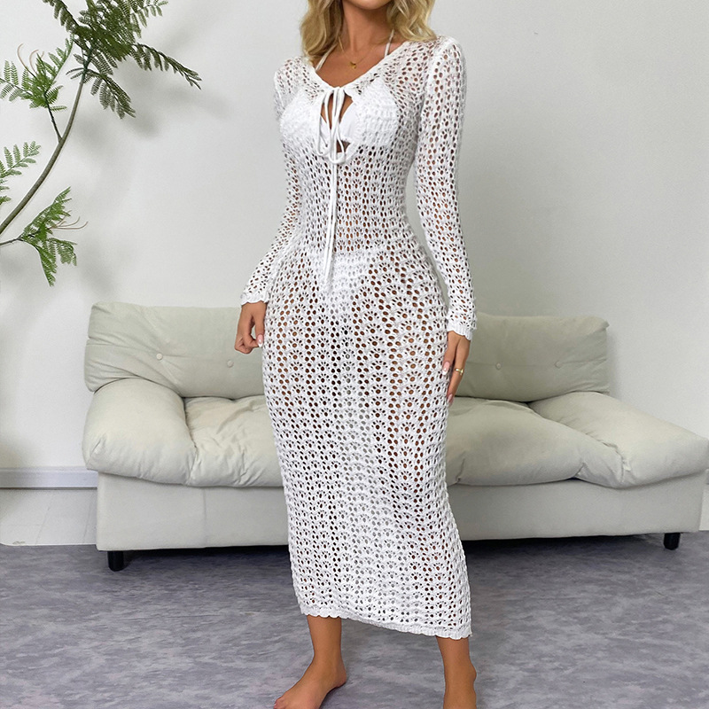 Vestido playero de manga larga ajustado con escote en V profundo y encaje para vacaciones en la playa, blusa con protección solar