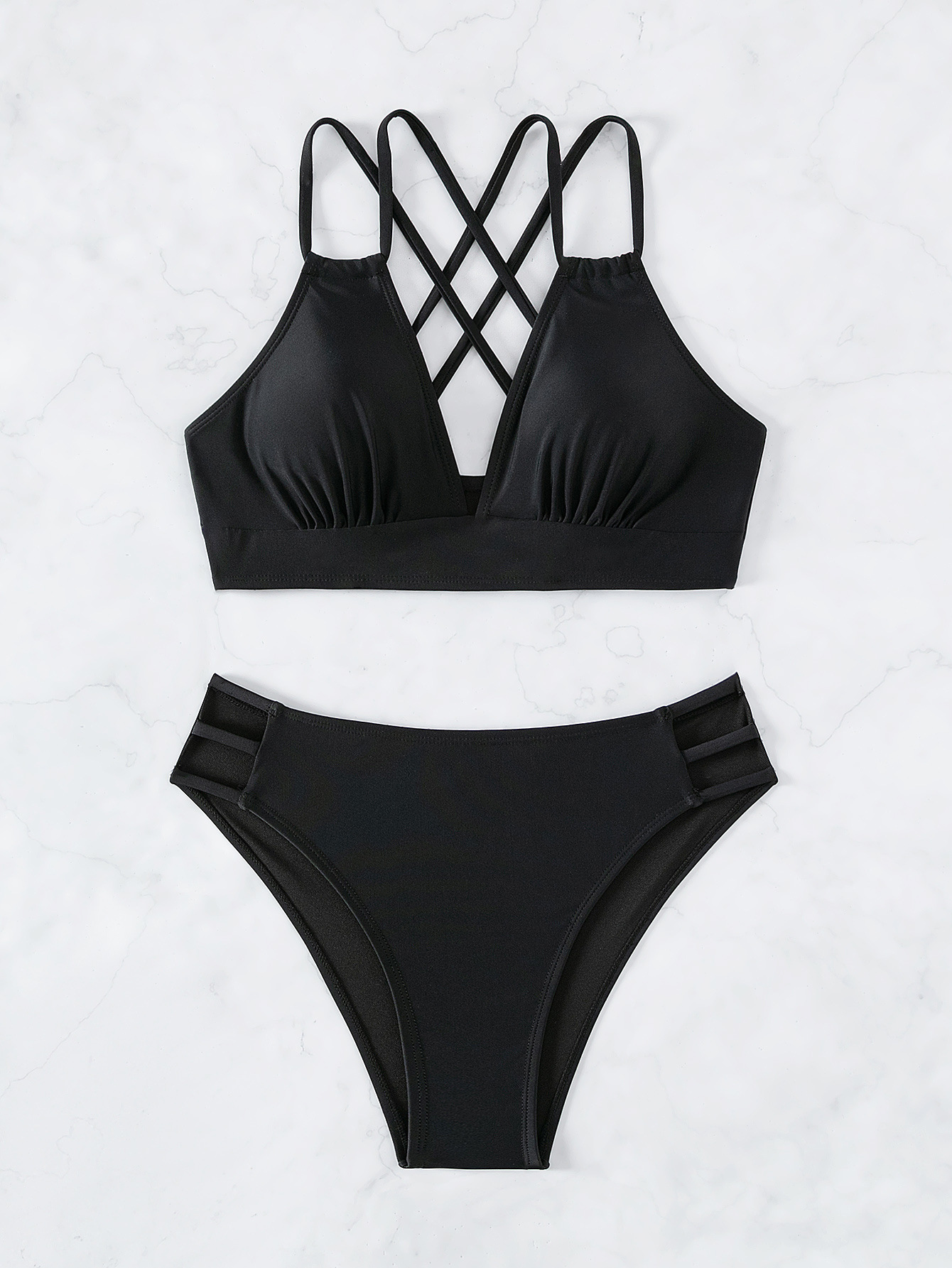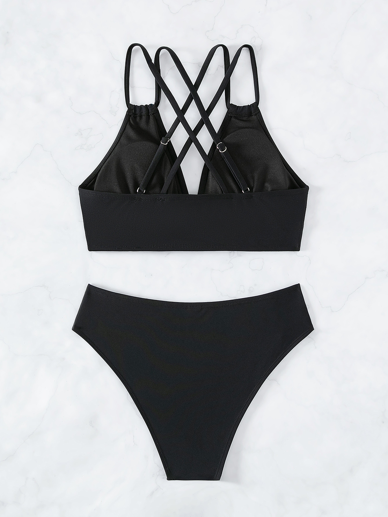 Bikini de color sólido con cuello en V y espalda descubierta, sexy, dividido