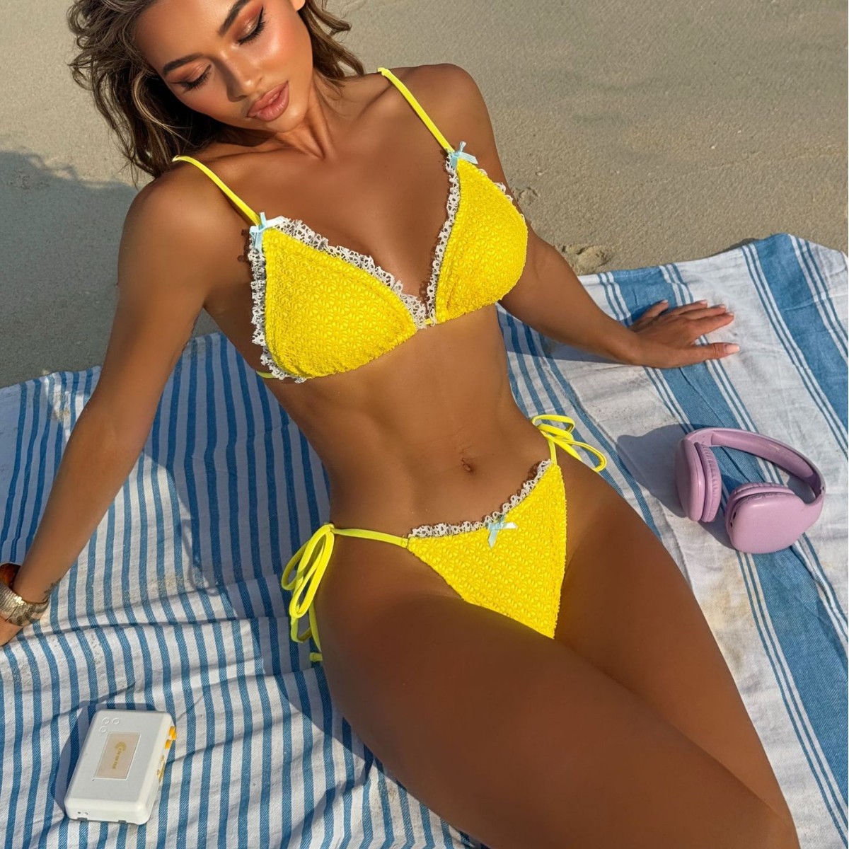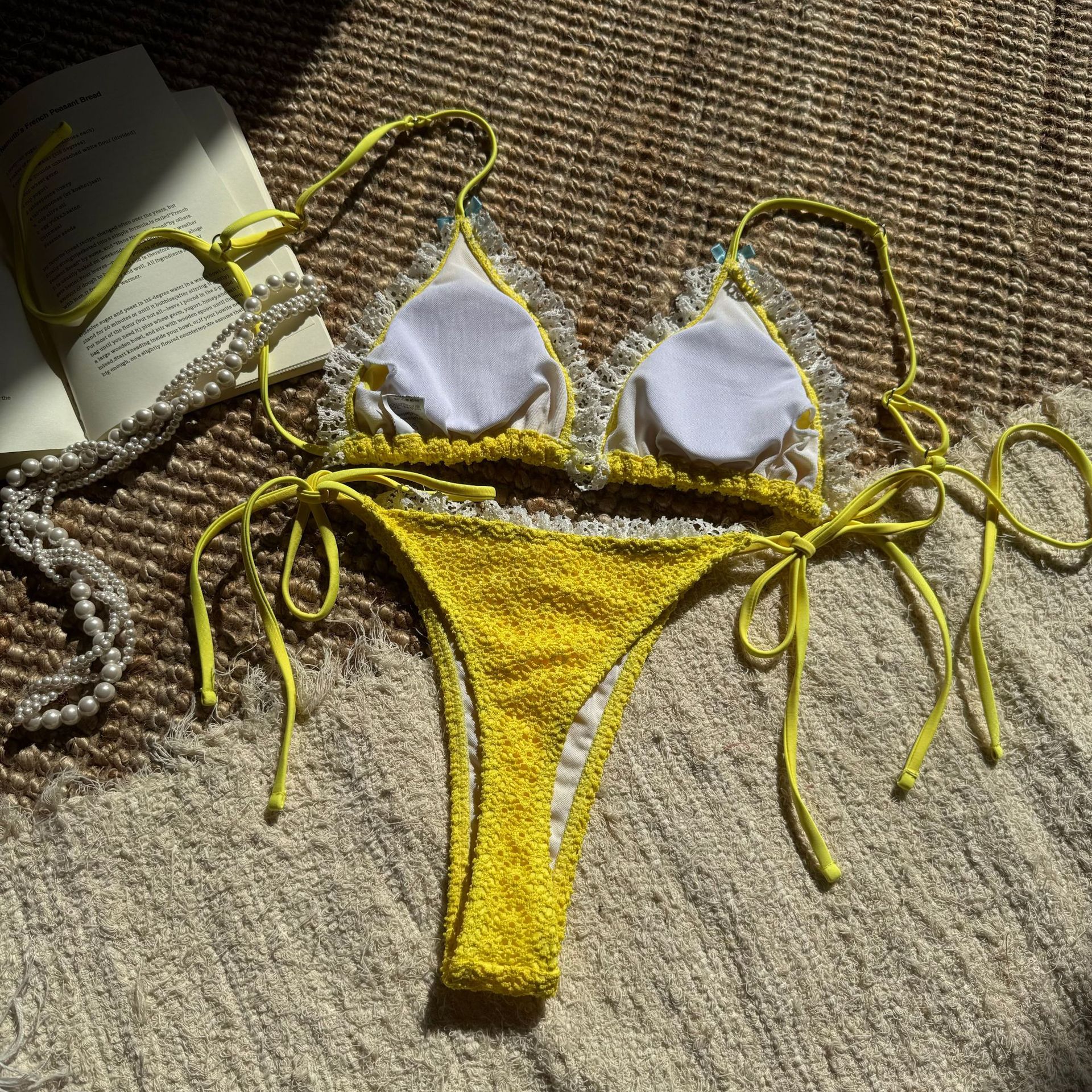Traje de baño de bikini con abertura en la espalda, sexy, con lazo y volantes en color de contraste