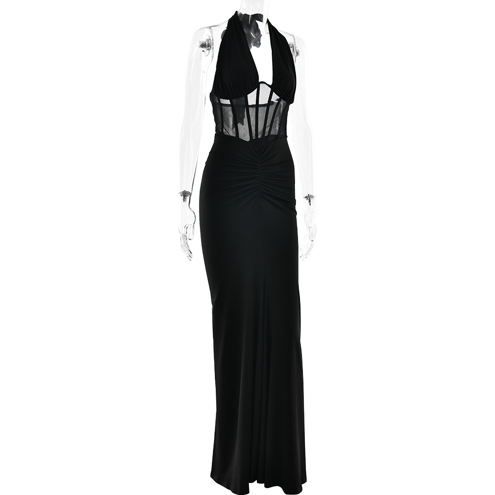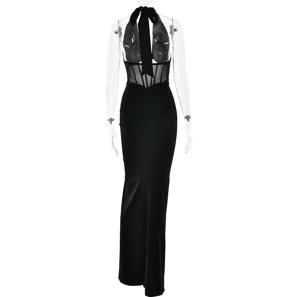 Elegant Women Lace up Maxi Dress Sexy Backless Pleated Sheath Dress