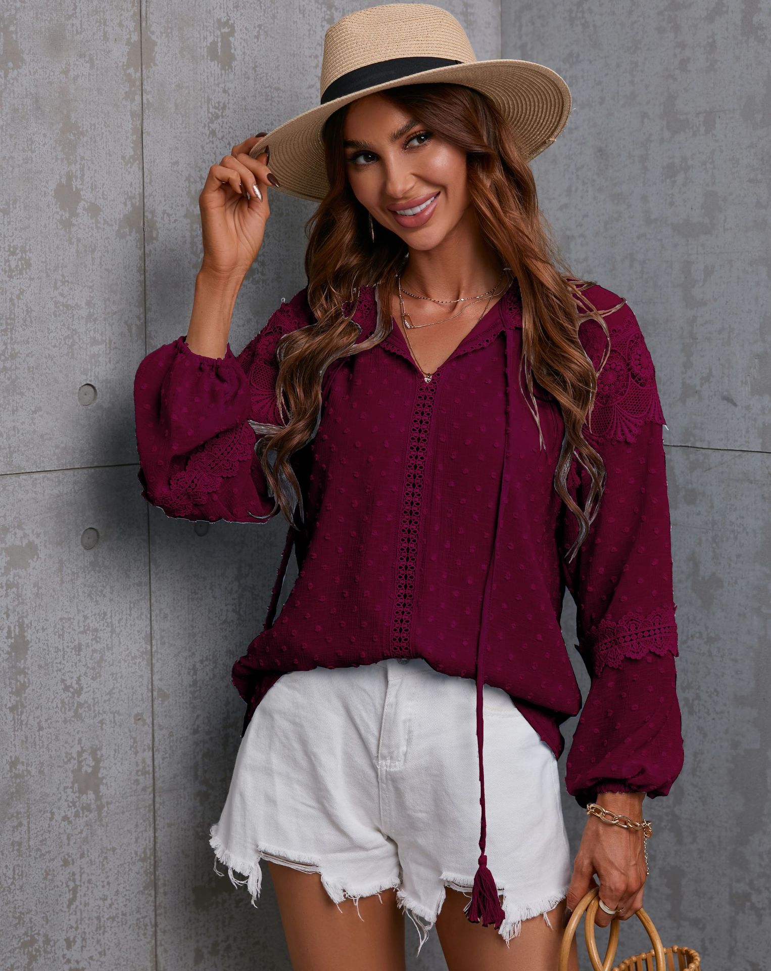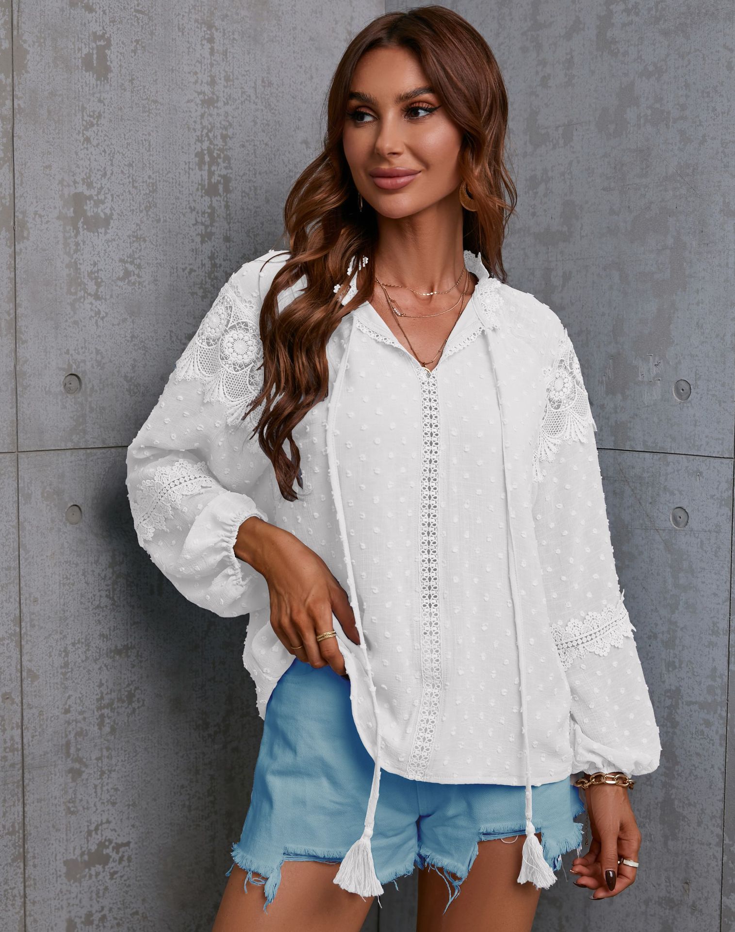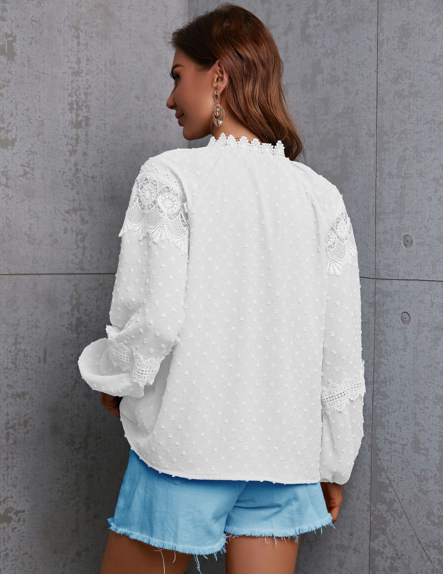 Fall Half-Open Collar Lantern Sleeve Polka Dot Chiffon Stitching Lace Shirt Loose Casual Women Clothing