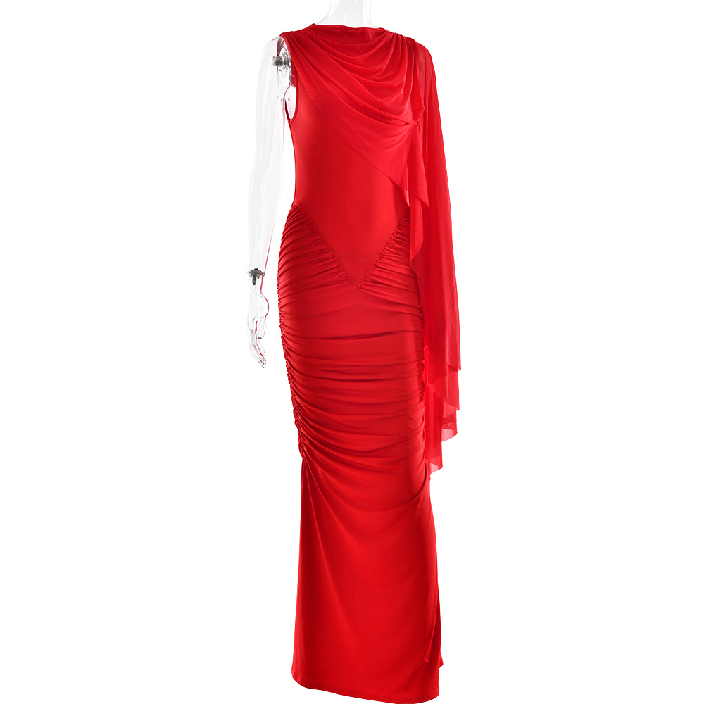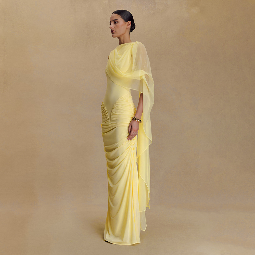 Fashionable Pleated Mesh Shawl Dress Sexy Sheath round Neck Slim Dress