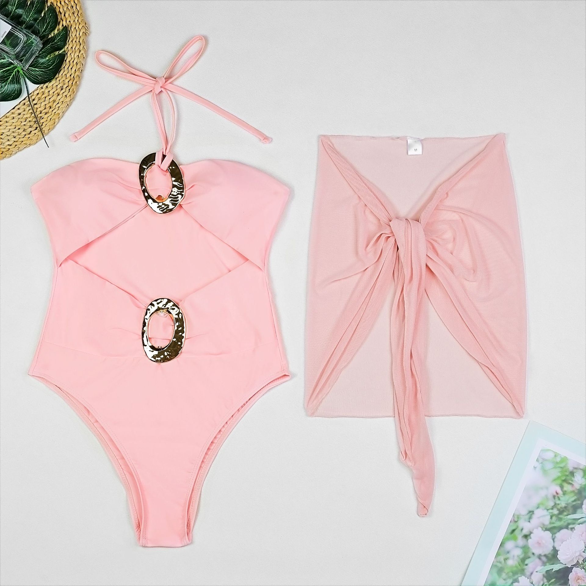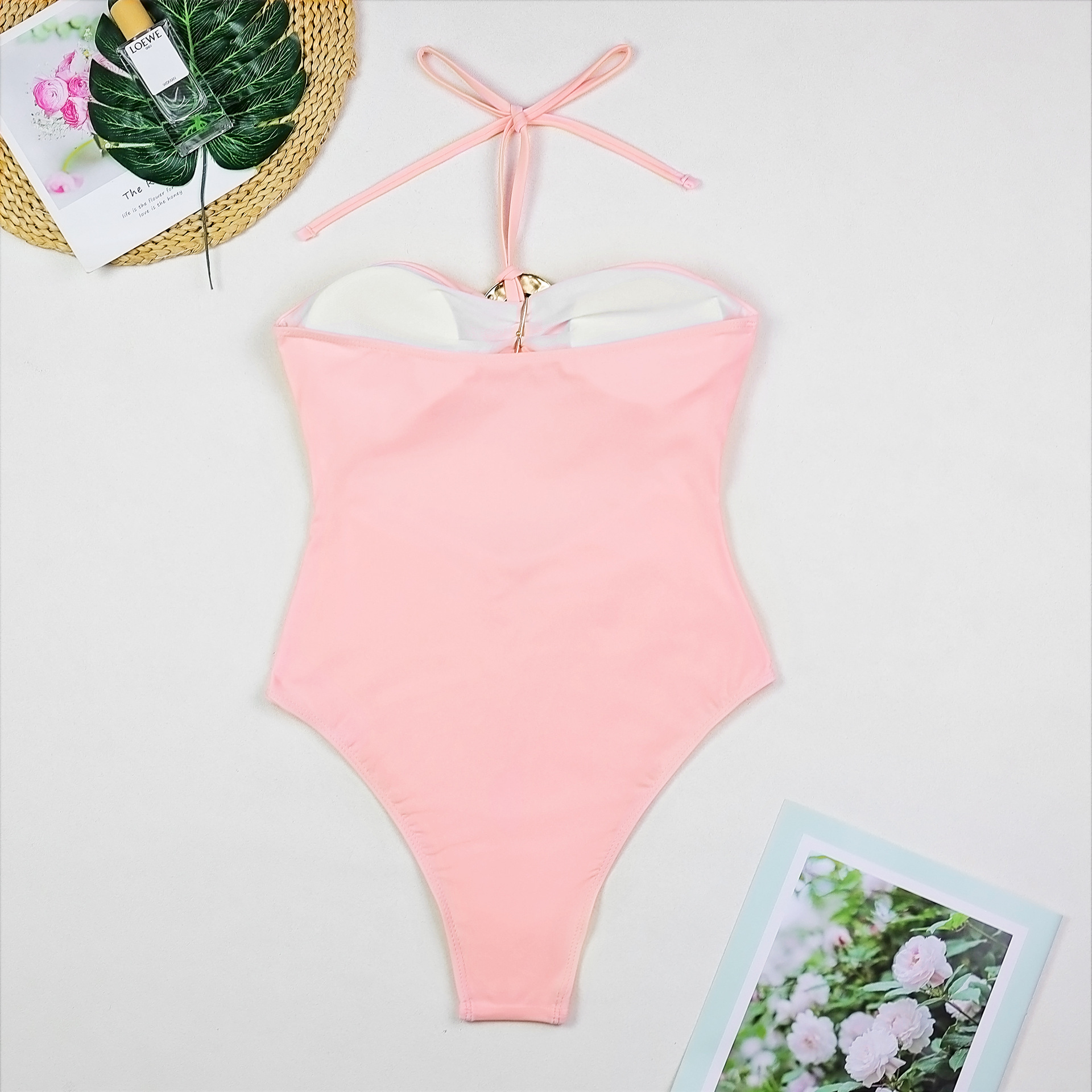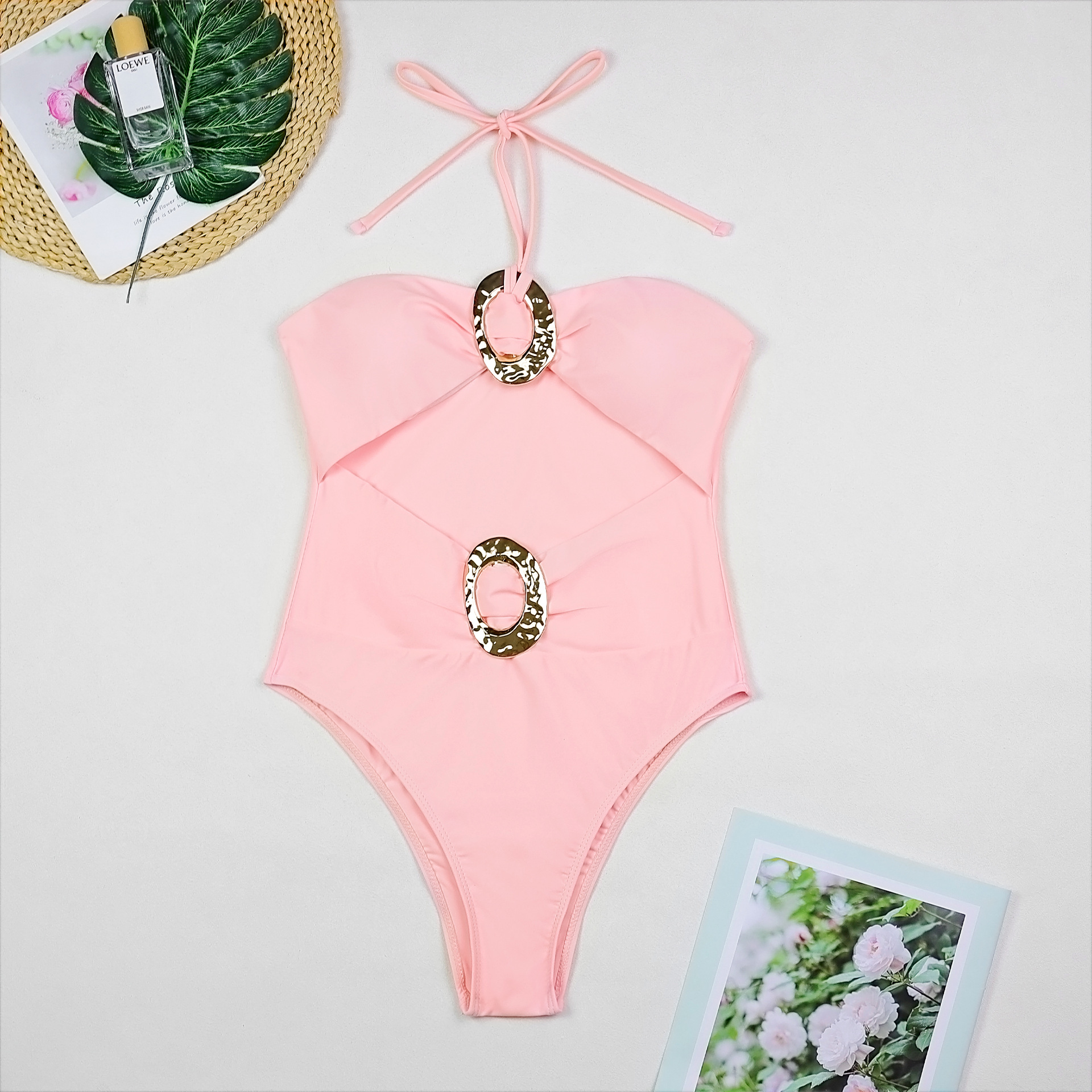 One Piece Swimsuit Women Halter Strap Two Piece Sexy Bikini Hollow Out Cutout Metal Solid Color Swimsuit Bikini