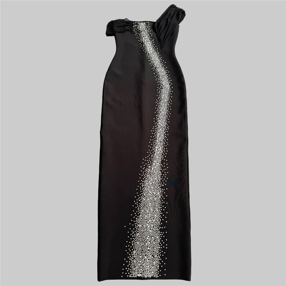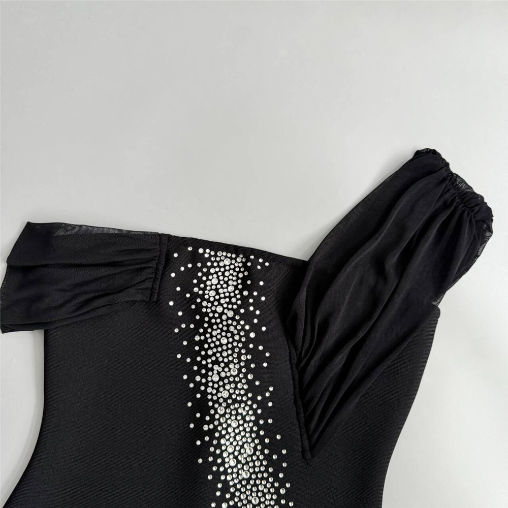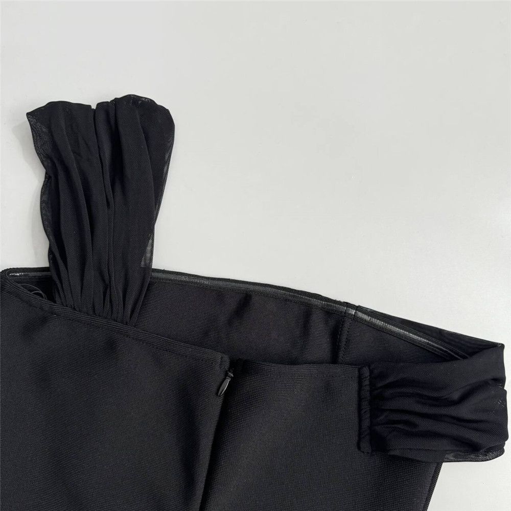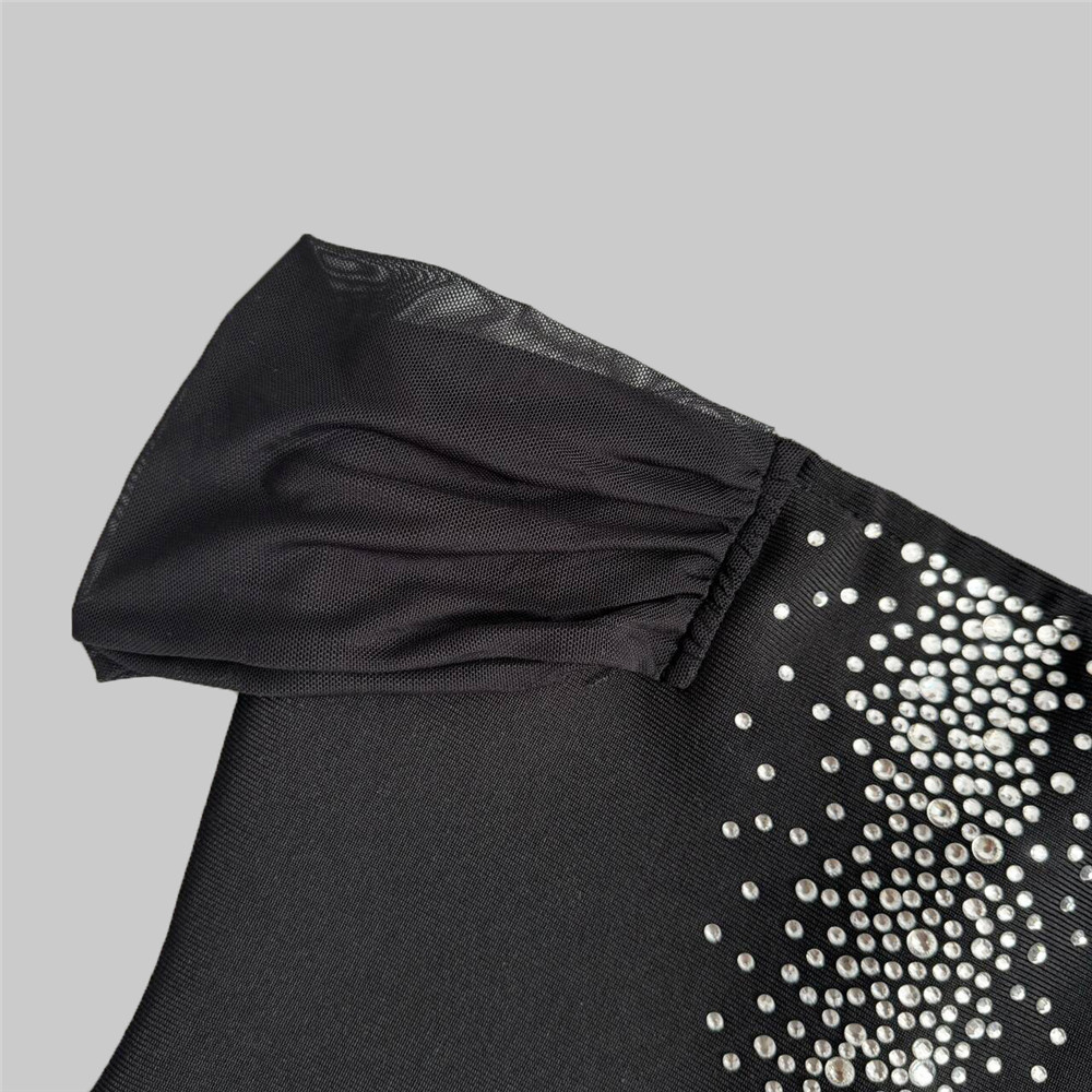 Vestido de fiesta sexy de un solo hombro con costuras de malla y diamantes de imitación en la cadera.