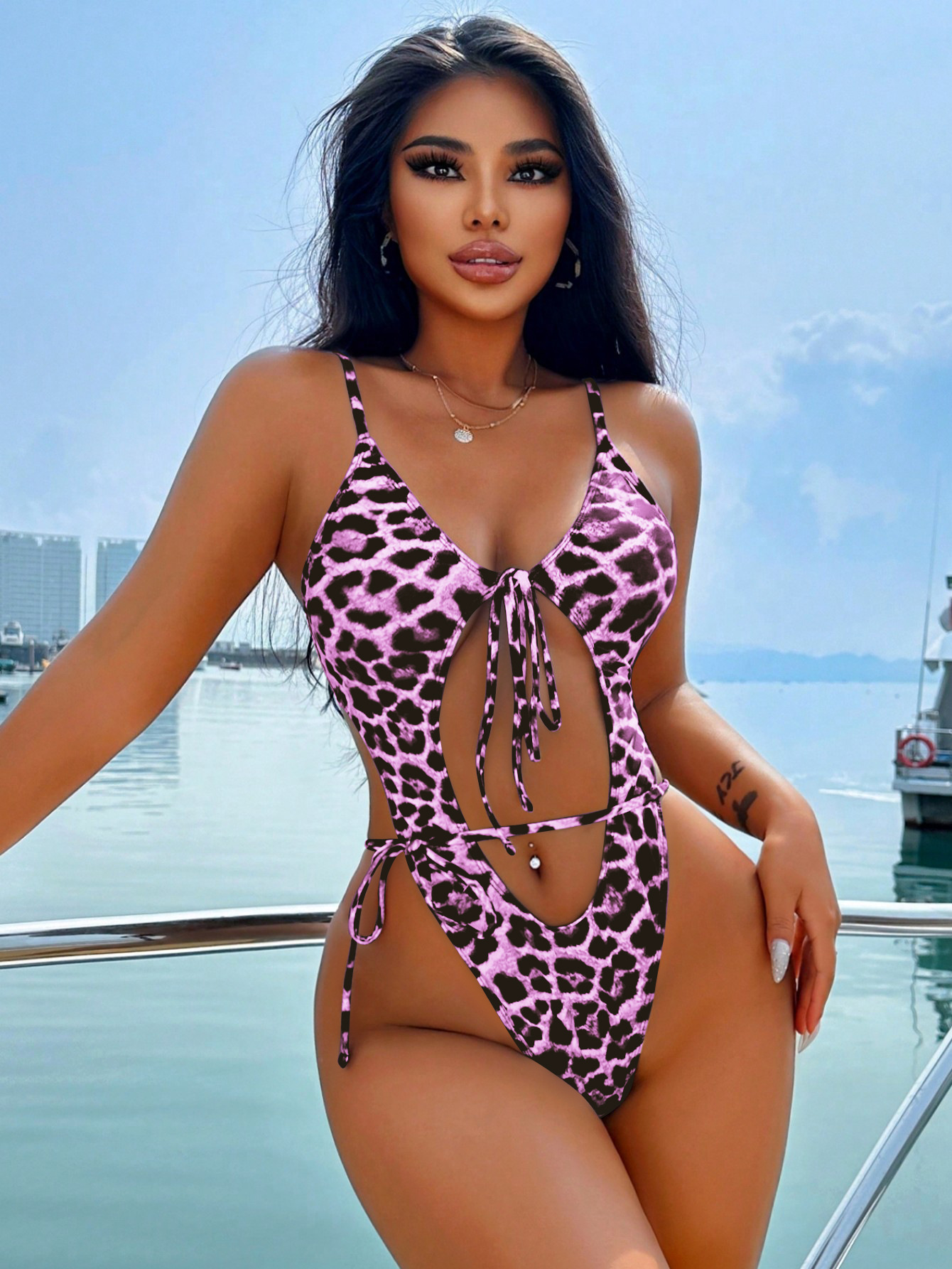 Traje de baño sexy con estampado de leopardo y cordones para vacaciones, traje de baño para mujer