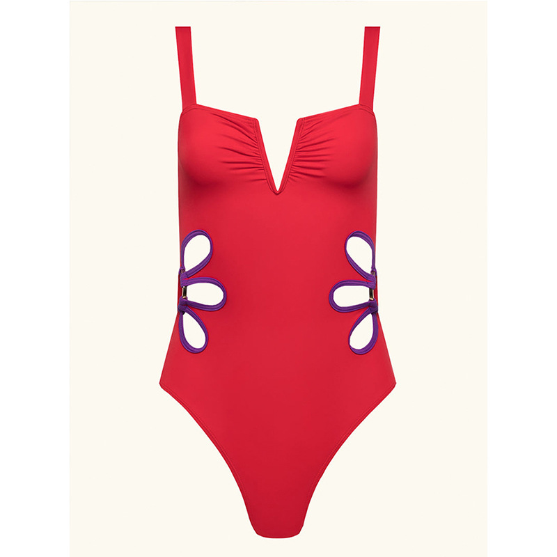 Traje de baño de una pieza para mujer, color sólido, sexy, escote en V, dos lados ahuecados, diseño recortado