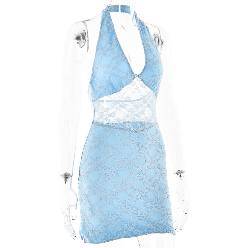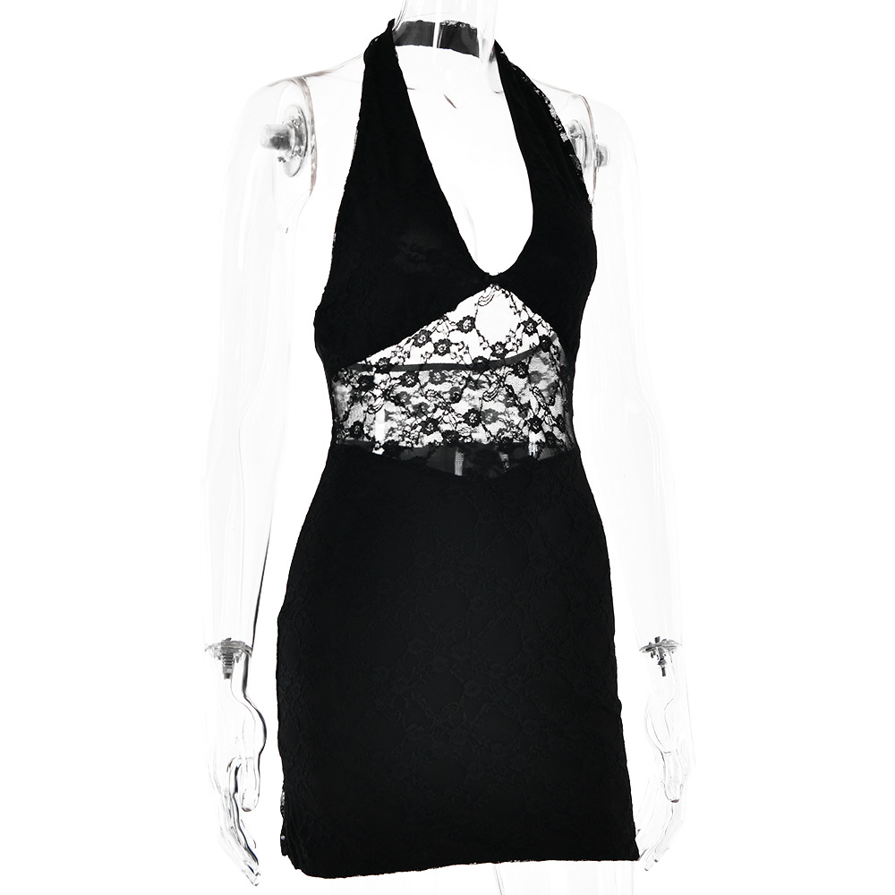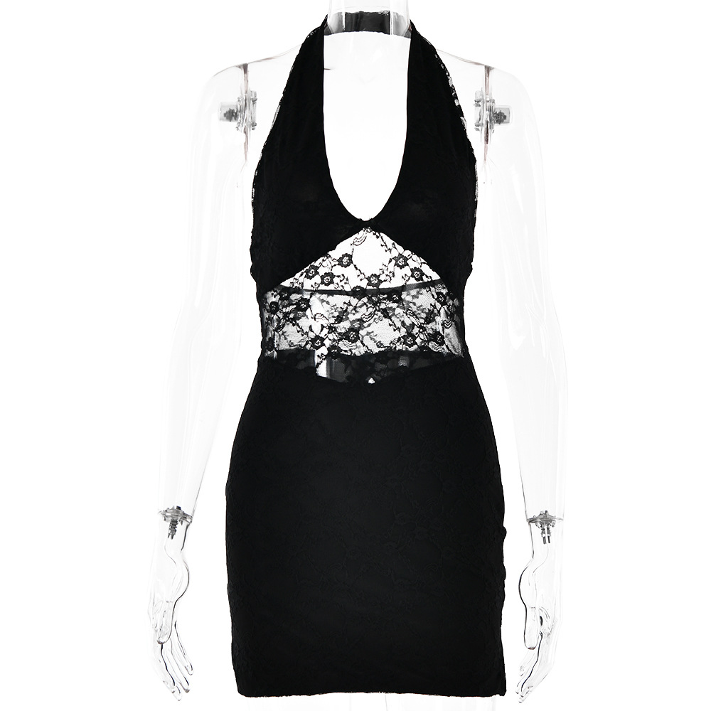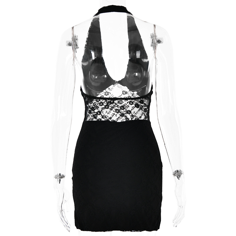 Vestido de primavera sexy de tendencia con escote en V, cuello halter, encaje cosido, vestido sin espalda