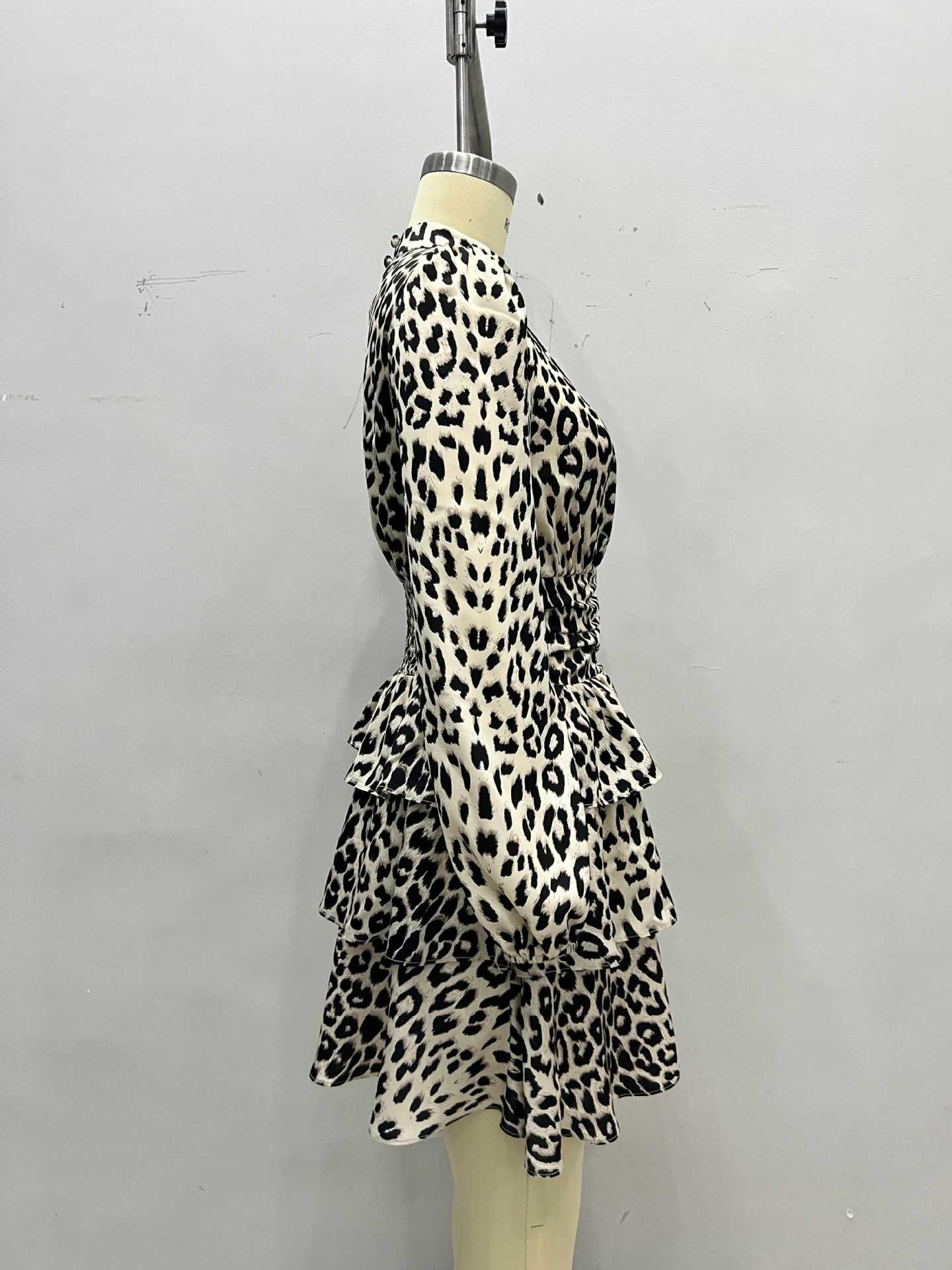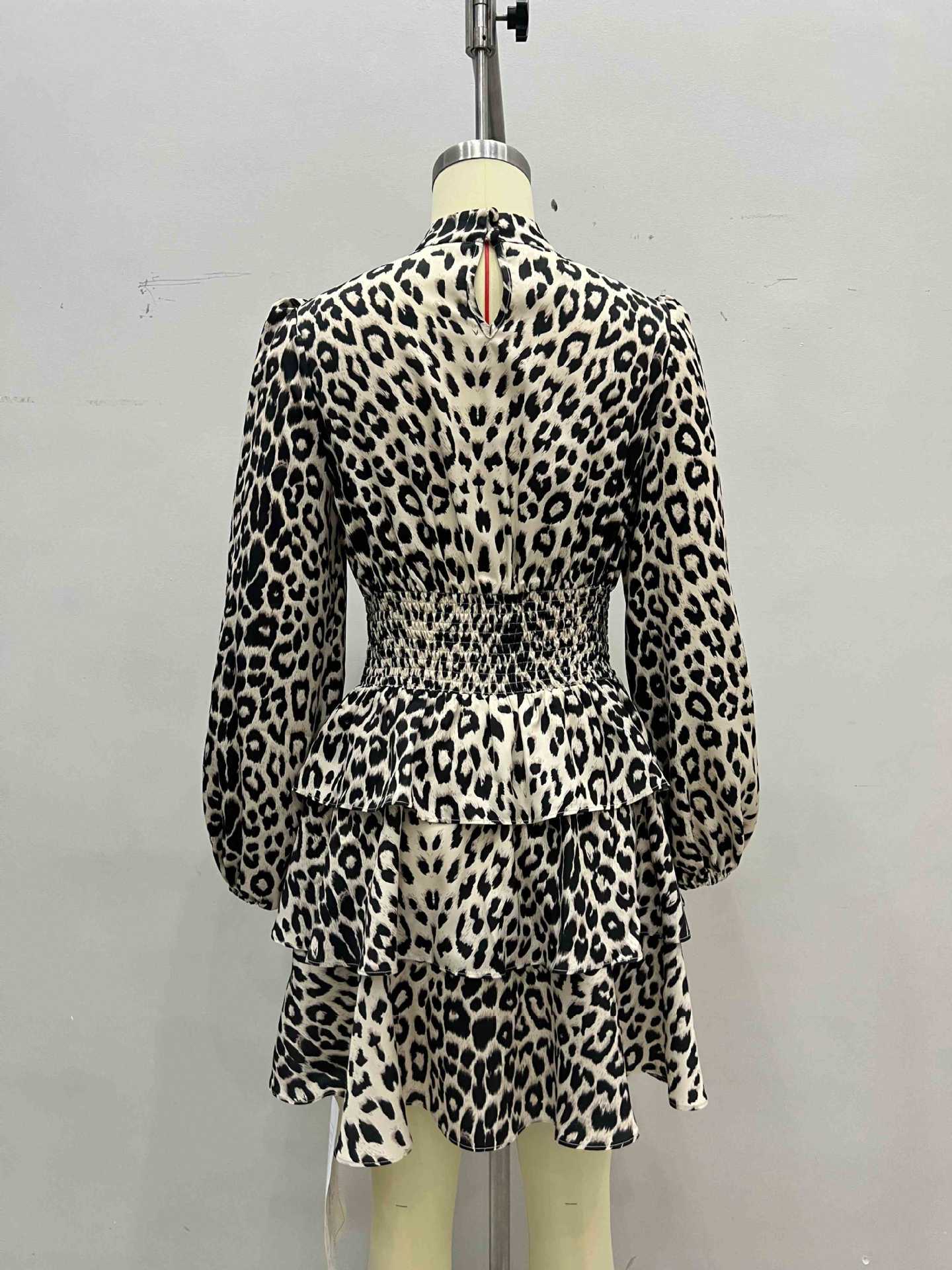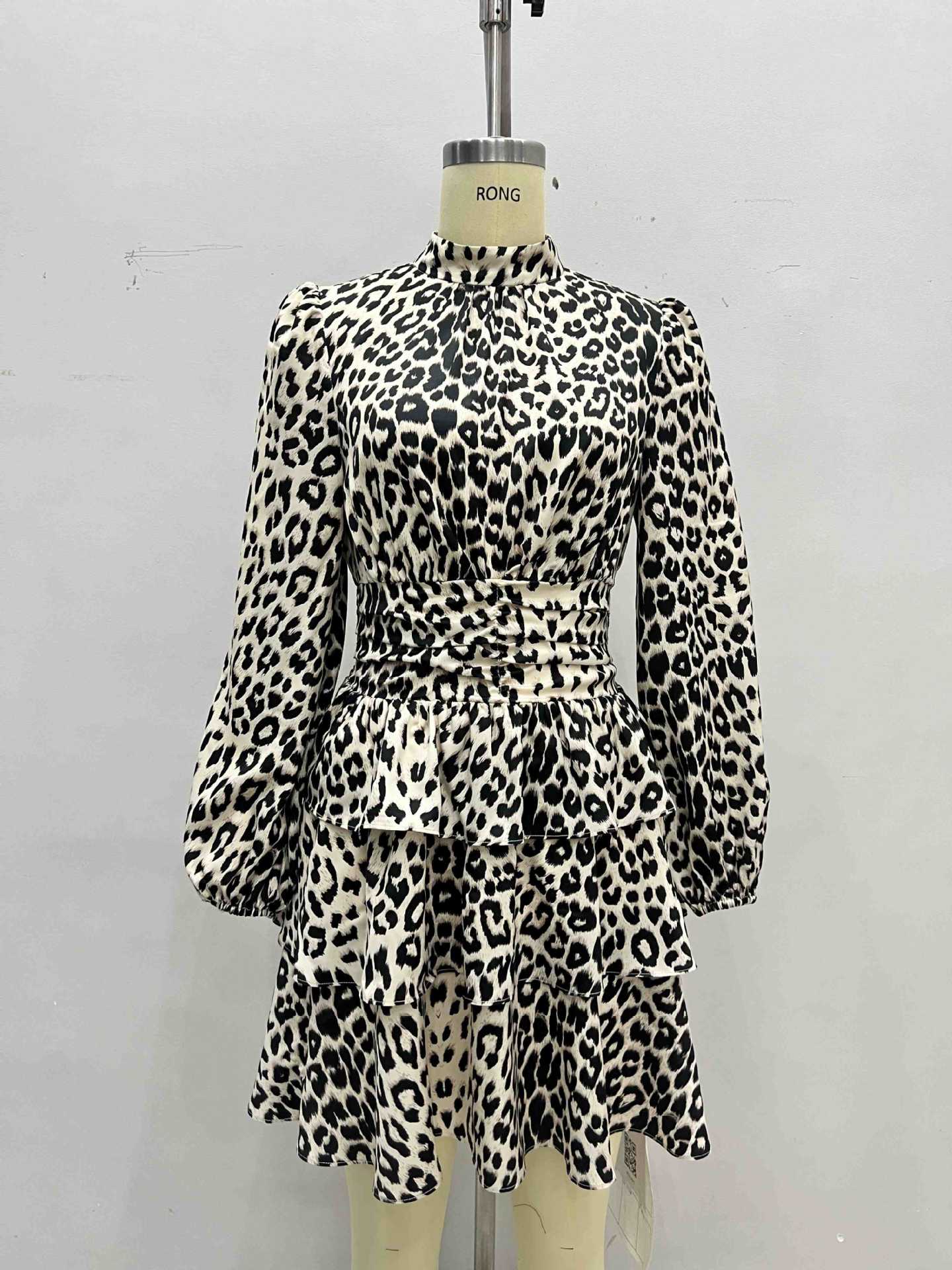 Women Clothing Spring Autumn Chiffon Leopard Print Bubble Long Sleeve with Multi Layer Swing Dress