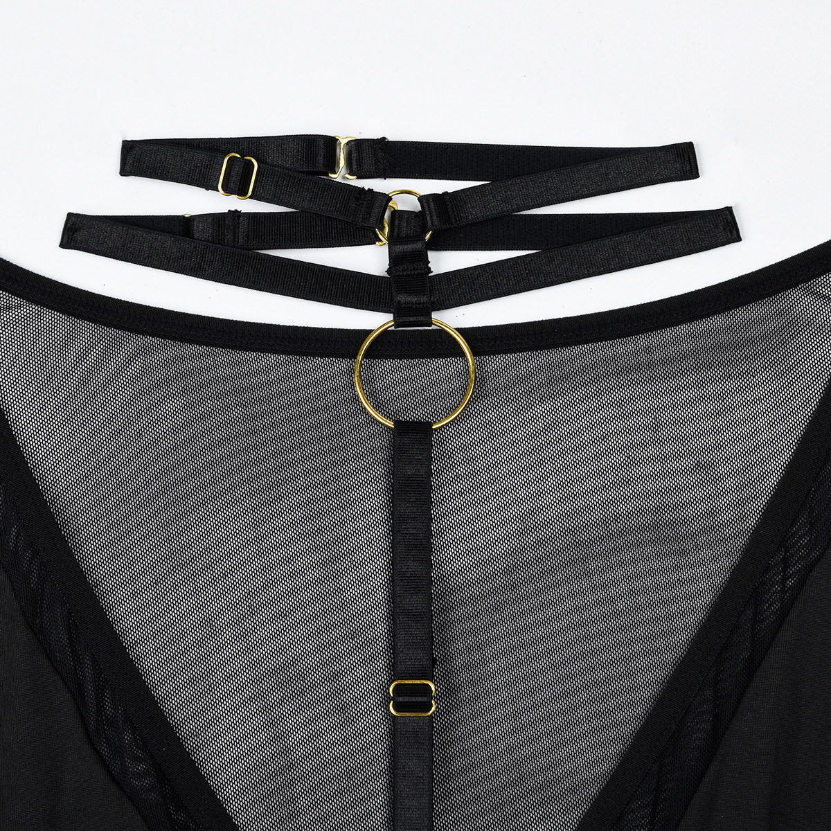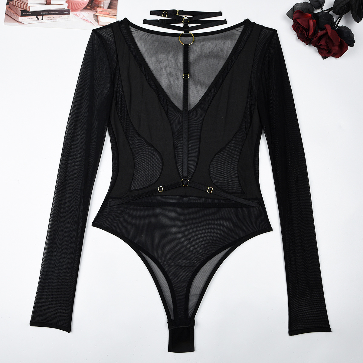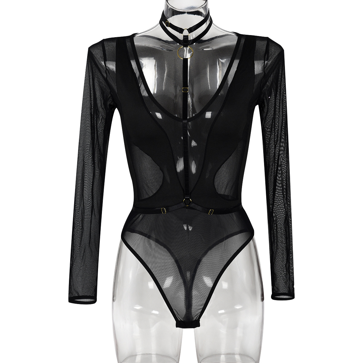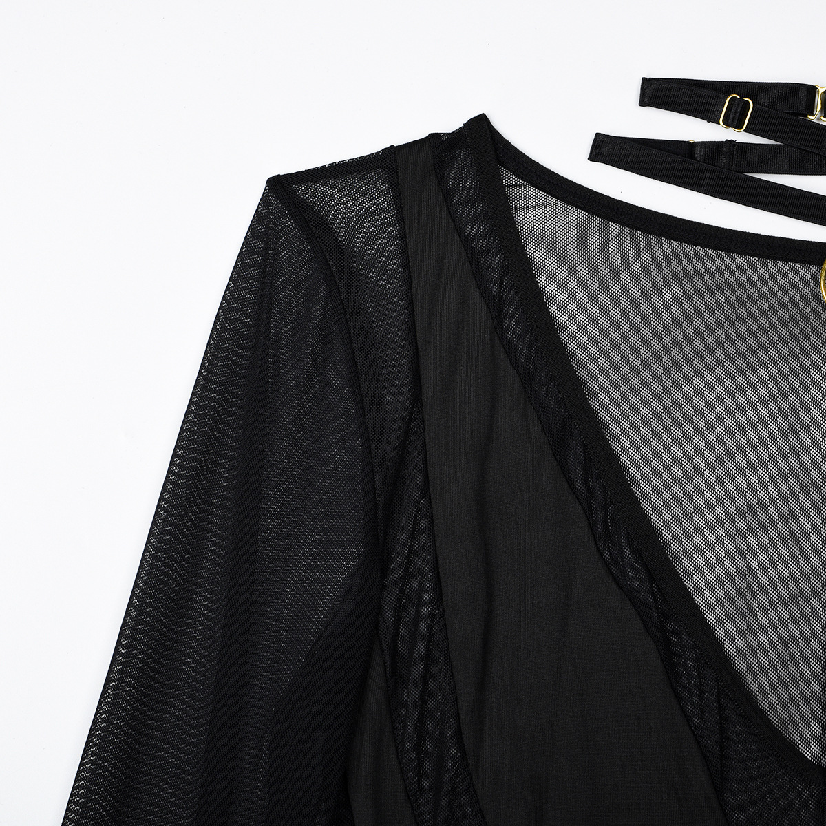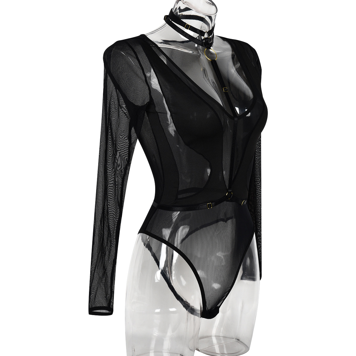 Mono de mujer primavera otoño malla manga larga ahuecado recorte transparente costura cuello en V halter