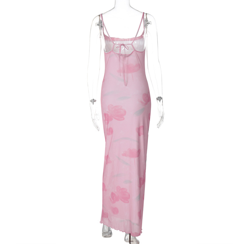 Vestido largo de verano con estampado floral, de malla, sexy, dulce y picante, con escote pronunciado