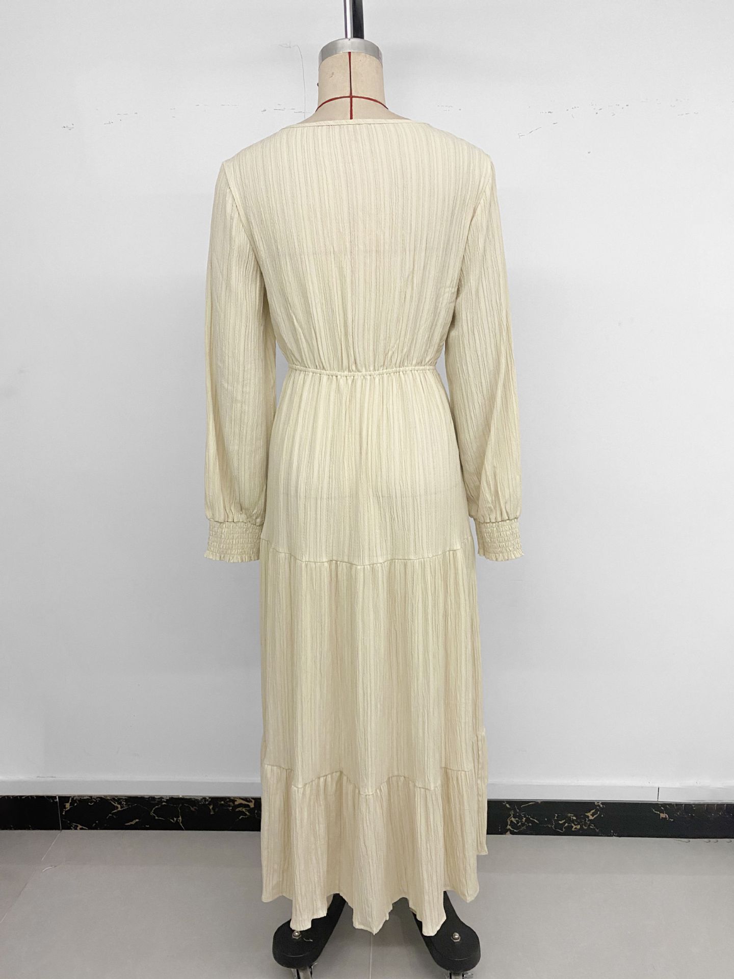 Autumn Elegant Long Sleeve Pleated V neck Solid Color Dress